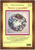 Вышитая картина: Венок – цветы и колибри. Выполненный в очень приятной цветовой гамме, нежные цветки, в окружении маленьких пташек – колибри. Словно приоткрытое окно в райский уголок вечного лета. Картина вышивается практически полностью крестом, с небольшим добавлением полукреста. Обшивки не много и она не сложная. Для смешанных цветов прилагается специальный диспенсер. Используется 43 цвета мулине. Ручная вышивка.