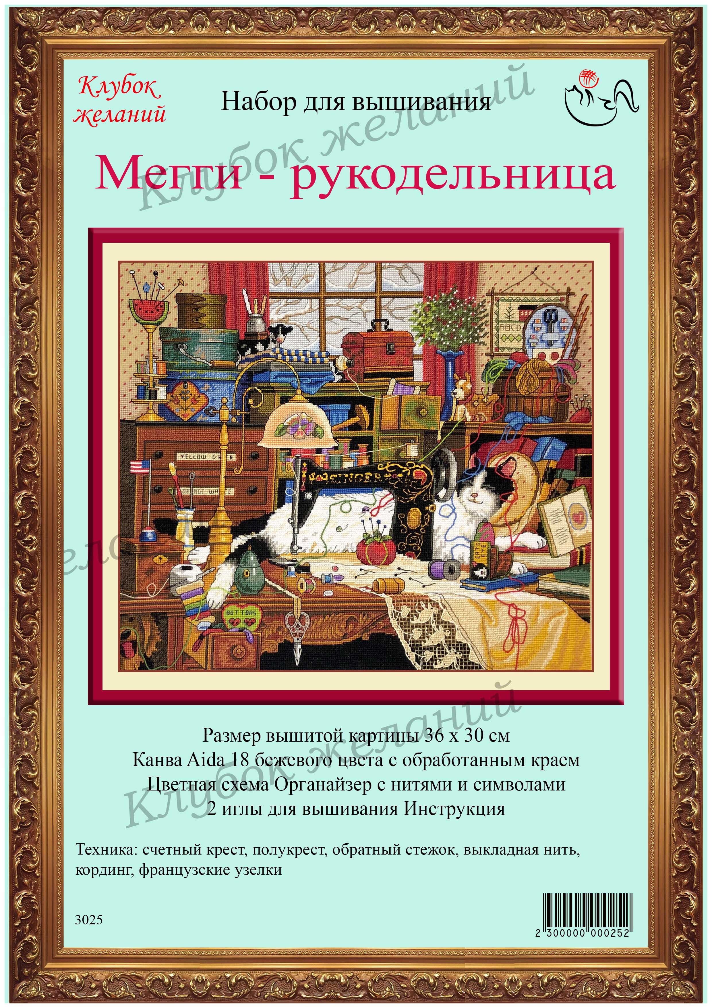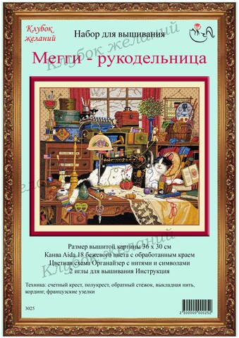 Вышитая картина: Удивительный, захватывающий мир рукоделия. Это красота, творчество и домашний уют. Именно поэтому так живописно расположилась Мегги – наша Мурка – на столе хозяйки. Чего здесь только нет! Мечта многих рукодельниц. И как тонко и ярко отображено это на вышитой картине! Посмотрите, кто притаился в левом нижнем углу? Очень много интересных деталей, которые превращают вышивание в настоящее удовольствие. Легендарная машинка Зингер вся расписана узорами, нежное кружево становится скатертью благодаря ей. А дальше – самое интересное! Кординг – везде – на машинке, все нити клубков, на скатерти. Это главное украшение картины. Милые дамы, перекручивайте нити в шнур сильнее, тогда и кординг будет рельефнее. Этак картина под силу настоящим мастерицам. Используется 48 цветов мулине.