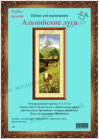 Вышитая картина: Летний безмятежный пейзаж. Необыкновенной чистоты и красоты долина среди гор. Луга с зеленой травой и полевыми цветами. Коровы на выпасе, спокойная и размеренная жизнь. Вышивая и глядя на эту картину, мы отдыхаем, словно сами побывали в этих альпийских лугах. Особенностью дизайна являются узкие кресты, которыми дополнена картина. В комплект входит подробная инструкция. Для смешанных цветов прилагается специальный диспенсер. Используется 22 цвета мулине. Ручная вышивка.