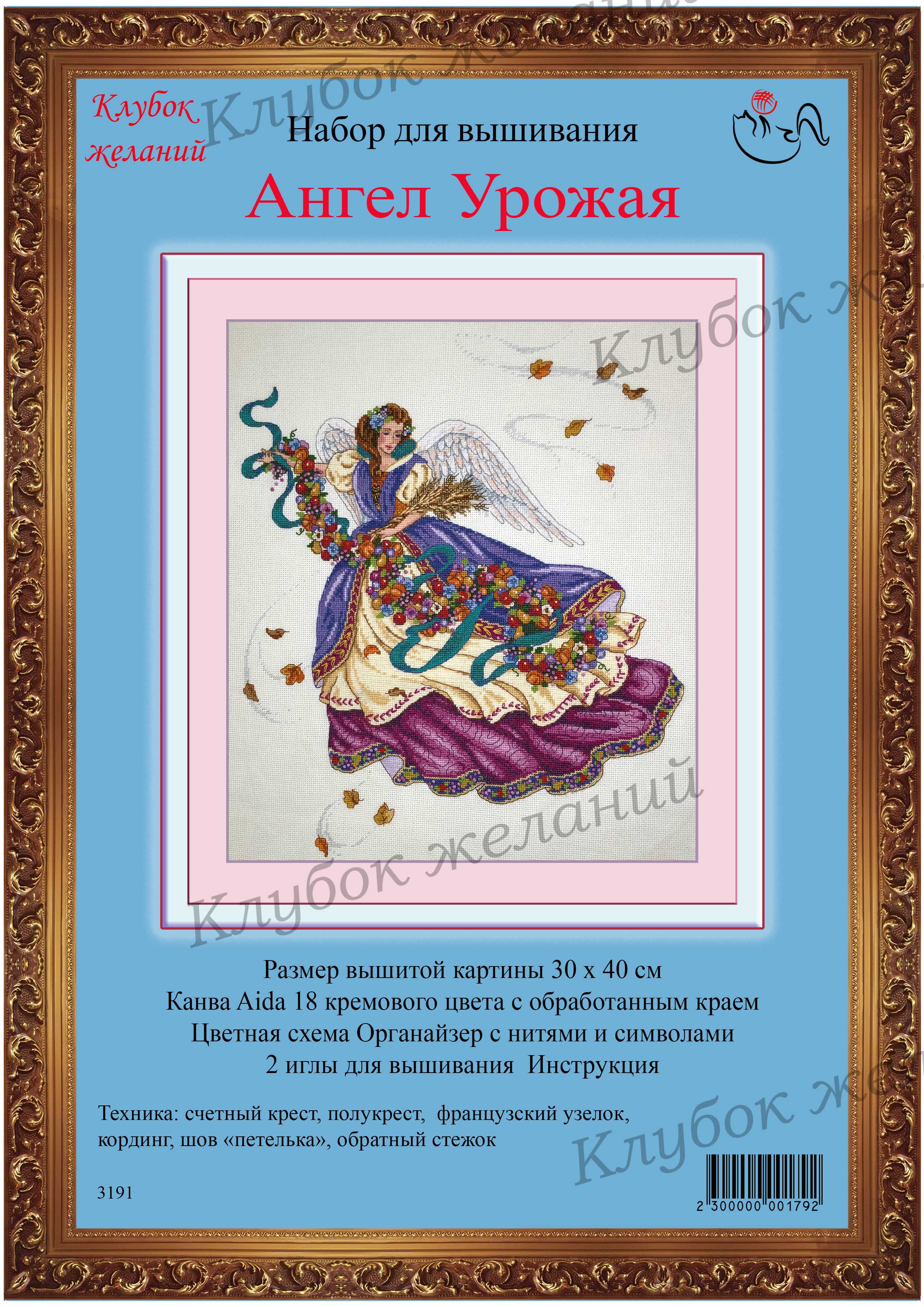Вышитая картина: Прекрасный ангел- юная девушка, с распростёртыми за спиной крыльями, несет в руках богатые дары природы. Урожай – гирлянда фруктов, в руках созревшие пышные колосья злаков. Развивается шарф цвета морской волны. Осень- пора урожая, и ветерок кружит опадающие листья. Расшито золотом одеяние ангела., Пышные французские узелки, шов «петелька» и кординг украшают юбки ангела. Для смешанных тонов прилагается специальный диспенсер. Дополнительные стежки, делающие картину такой прорисованной, выполнены обратным стежком. В работе использовано 42 цвета мулине.
