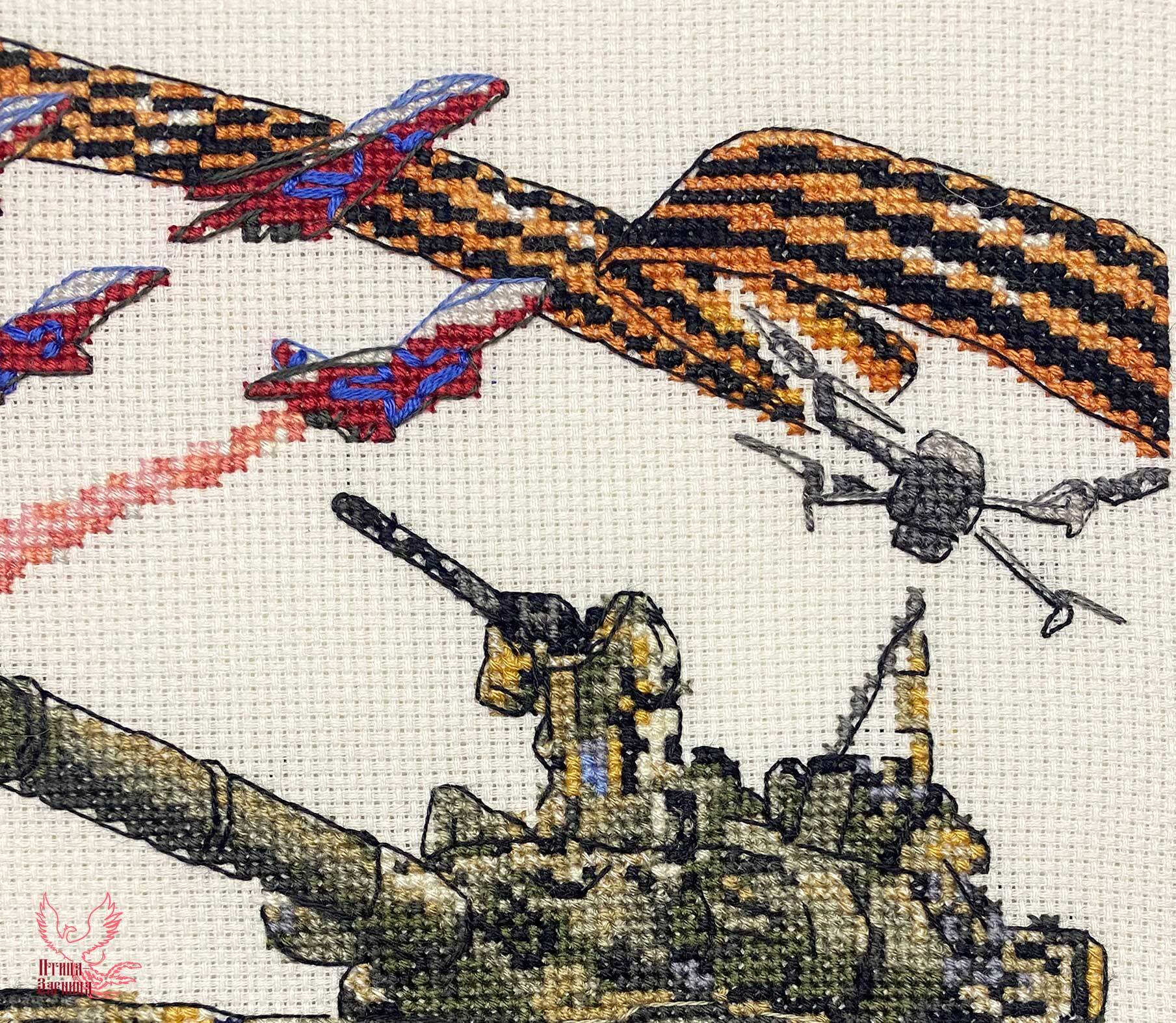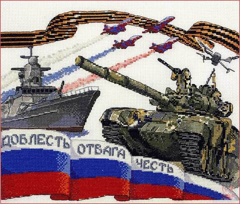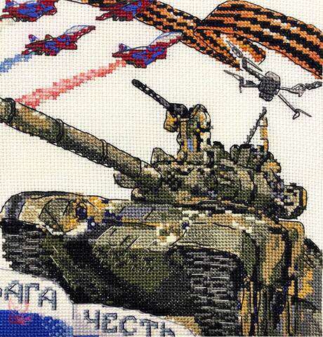 Вышитая картина: Посвящается нашим доблестным защитникам – от солдата до генерала, адмирала, всем, кто служил и служит Отечеству. «У России есть только два союзника: ее армия и флот». Это слова российского императора Александра III. Мы гордимся нашей армией, флотом, военно-воздушными войсками. И новое в нашей армии – дроны. Боевая техника на картине, обрамленная символами российского триколора и Георгиевской лентой. Мы, женщины, сейчас дома, с детьми, бабушками. Но мы с вами, ребята, мы – ваш крепкий и надежный тыл.