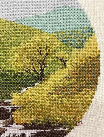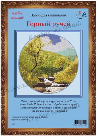 Вышитая картина: Горы, поросшие зарослями кустарников и деревьев. С небольшого склона бежит в долину чистый холодный ручей. Бежит и прыгает по камням, принося нам свежесть и радость чистой прозрачной воды. Перекатываются струи, блестя на солнце. Вдали видны высокие горы. Высокое и ясное небо над головой. Никаких признаков цивилизации. Тишина и покой вокруг, только шум горного ручья. Словно кадр, сделанный фотоаппаратом, окно в старые добрые времена. Особенностью дизайна являются узкие кресты, которыми дополнена картина. В комплект входит подробная инструкция. Для смешанных цветов прилагается специальный диспенсер. Используется 20 цветов мулине.
