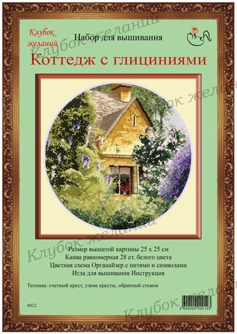 Вышитая картина: В глубине сада, закрытый ветвями деревьев и кустов, стоит сельский домик. Распахнуто окно, на подоконнике цветы. Летний день, тепло и тихо. спадающие глицинии – украшение этого сада. Ветви обозначены несколькими стежками. Словно кадр, сделанный фотоаппаратом, окно в старые добрые времена. Особенностью дизайна являются узкие кресты, которыми дополнена картина. В комплект входит подробная инструкция. Для смешанных цветов прилагается специальный диспенсер. Используется 27 цветов мулине. Ручная вышивка.