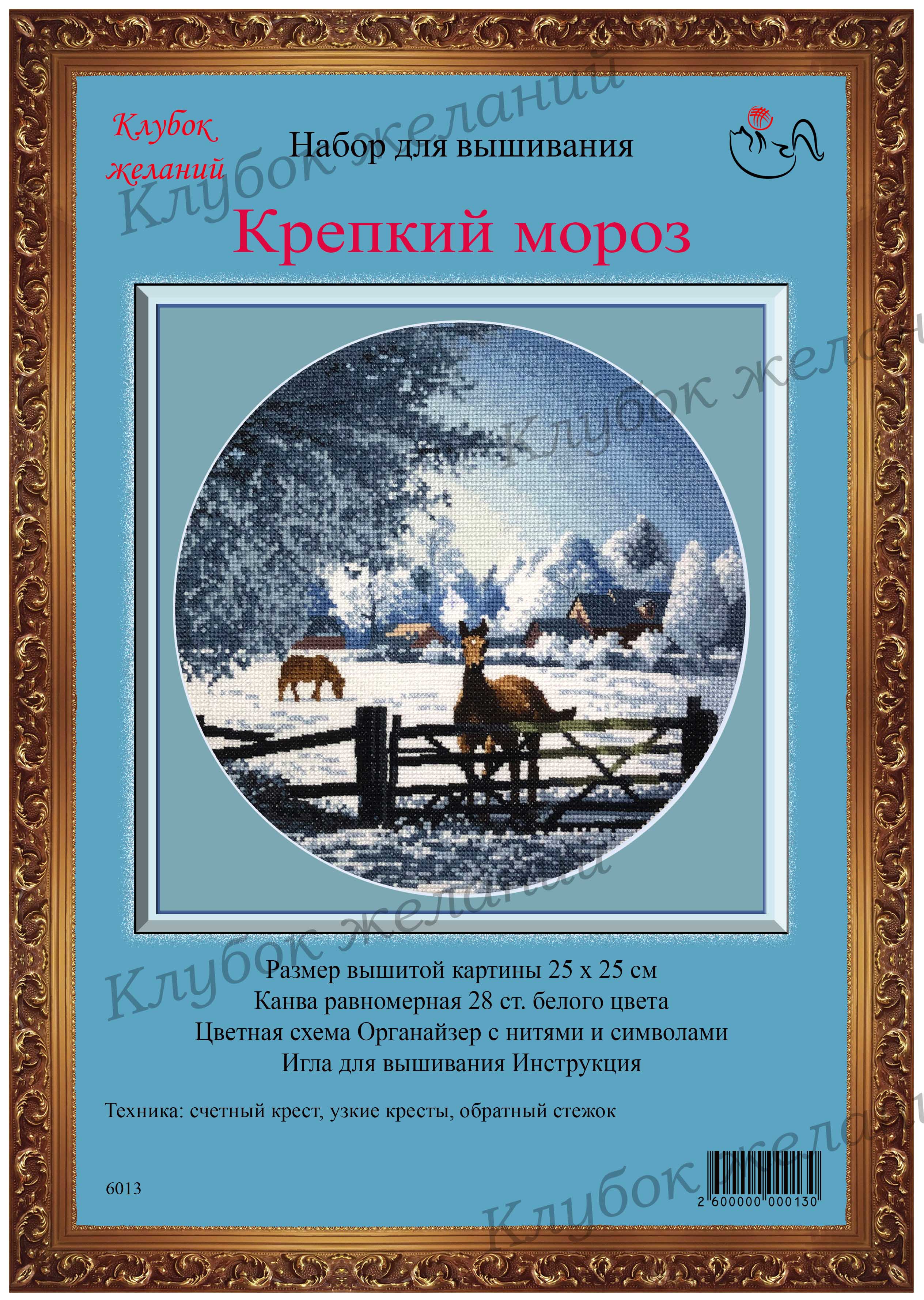 Вышитая картина: Зима. Морозный день. Ясное зимнее небо, укрытые снежными шапками деревья и крыши домов. Тихо в такое время в деревне. В загон выпущены погулять кони. Им радостно и приятно пробежаться по чистому хрустящему снегу, вдохнуть морозного воздуха. Вожак насторожился, смотрит внимательными глазами, поводит чуткими ушами. Словно кадр, сделанный фотоаппаратом, окно в старые добрые времена. Особенностью дизайна являются узкие кресты, которыми дополнена картина. В комплект входит подробная инструкция. Для смешанных цветов прилагается специальный диспенсер. Используется 23 цвета мулине.