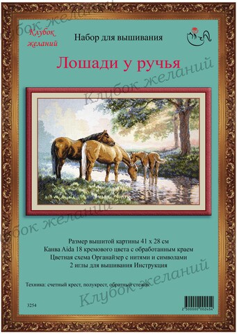 Вышитая картина: Лето. Тихое утро. У ручья мы видим редкую и удивительно живую картину – семья лошадей пришла на водопой. Маленький рыжий жеребенок следует за родителями. Гнедой конь положил голову на спину своей подруге. Он внимательно смотрит и охраняет семью. Пейзаж вокруг выполнен полукрестом. Для смешанных тонов прилагается специальный диспенсер. Дополнительные стежки, делающие картину такой прорисованной, выполнены обратным стежком. В работе использовано 38 цветов мулине.