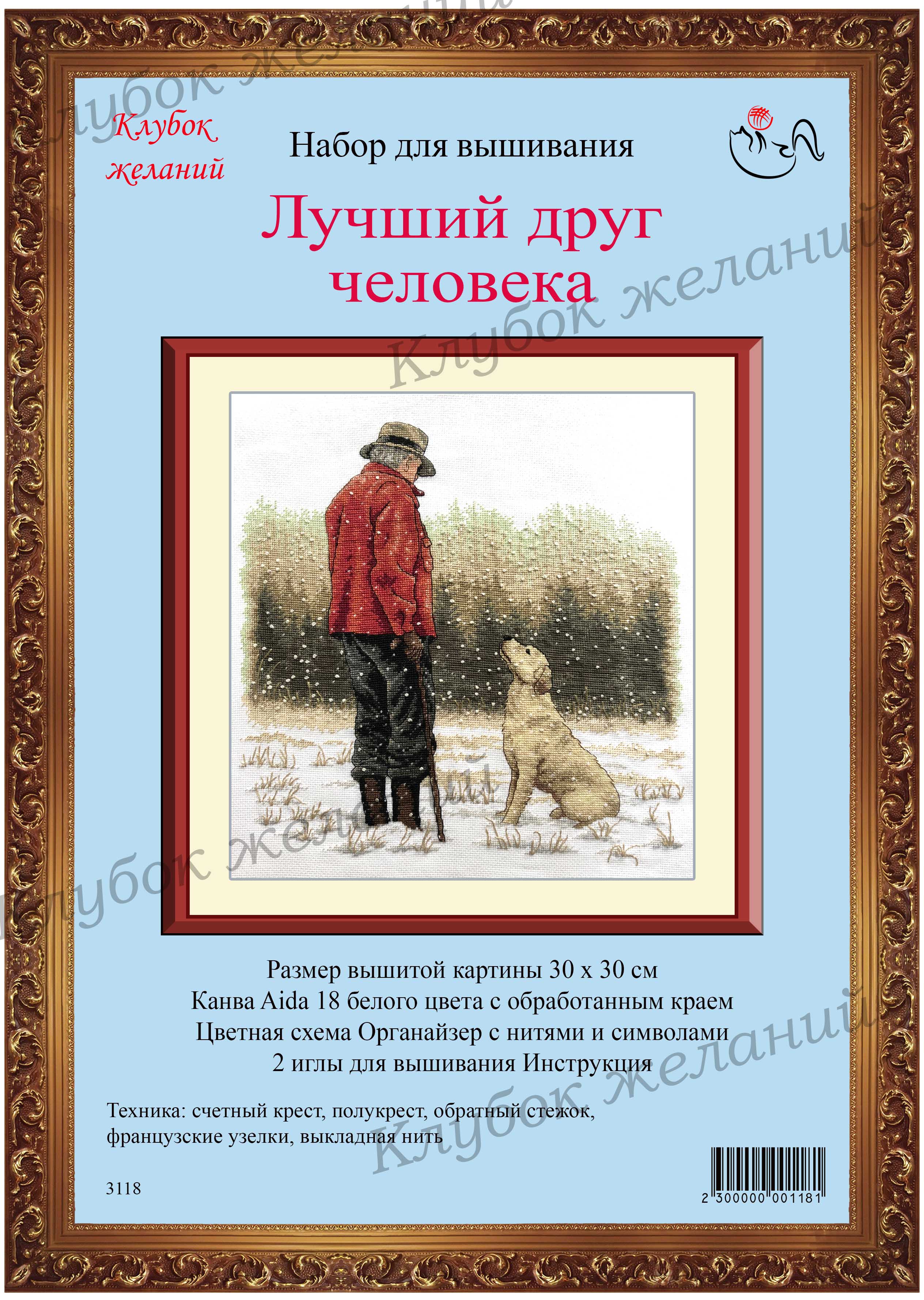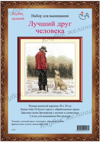 Вышитая картина: Название очень верное. Собака – самый верный и преданный друг. И это картина передает все –умный внимательный взгляд белого лабрадора. Его поза - ожидание и готовность выполнить команду хозяина. Они неразлучны – человек и пес. Вышивается крестом и плотным полукрестом – до 5 нитей в сложении. По полю картины рассыпаны французские узелки – хлопья снега. Для смешанных тонов прилагается специальный диспенсер. Дополнительные стежки, делающие картину такой прорисованной, выполнены обратным стежком. Используется 24 цвета мулине. Ручная вышивка.