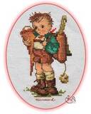 Вышитая картинка. Мальчик с рюкзачком за спиной. Он собирается в школу. Шортики и белая рубашка, зеленая курточка. В пакете- все, что не уместилось в рюкзак. В рюкзаке – линейка и много учебников и тетрадок. Коричневые башмаки и белые гольфы. Для смешанных цветов прилагается специальный диспенсер. В работе использован 18 цветов мулине.