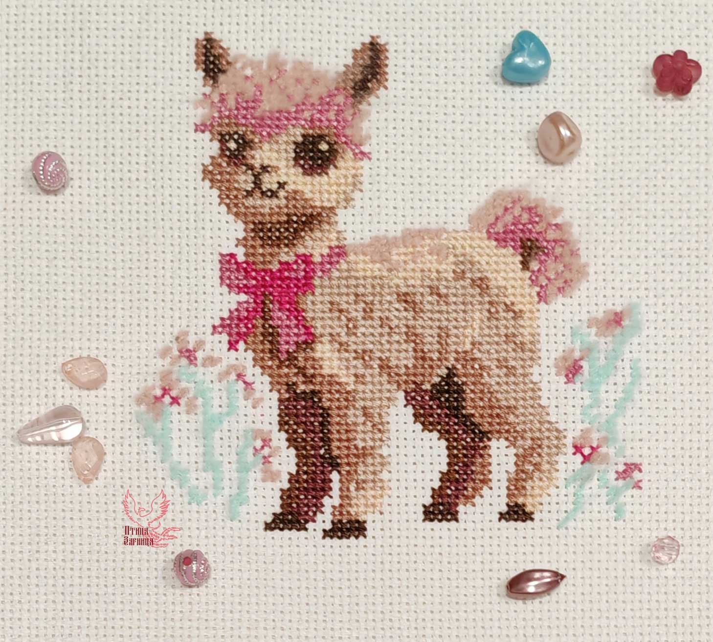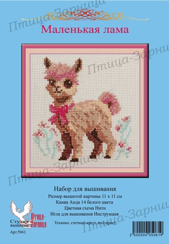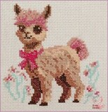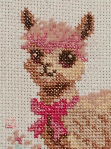 Вышитая картина: очаровательная маленькая лама смотрит на нас. Чуткие ушки, умные большие глаза. На шее – розовый бант. И сама она словно в розовой дымке. Розовыми пушистыми нитями вышита челка, спинка и хвостик. Также цветочки и травки. В работе использовано 10 цветов мулине. Их легко разобрать по цветам. В ключе указано сколько нитей каждого цвета входит в набор. Вышить эту ламу может даже начинающая рукодельница.