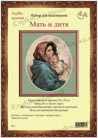 Вышитая картина: Мама прижимает к груди спящего малыша. Взгляд молодой женщины устремлен вдаль, в нем выражаются тревога и переживания за будущее ребенка. Что несет ему предстоящая долгая жизнь? Надежда на лучшее читается в облике молодой матери. А малыш спокойно спит в теплых любящих объятиях. В этой картине –молитва каждой мамы о своих детях. Очень выразительны глаза. Картина выполнена в форме овала. Крест, полукрест, немного полукрестиков. Цветовая палитра хорошо сочетается и идет от тона к тону. Для смешанных цветов прилагается специальный диспенсер. Используется 29 цветов мулине. Ручная вышивка.