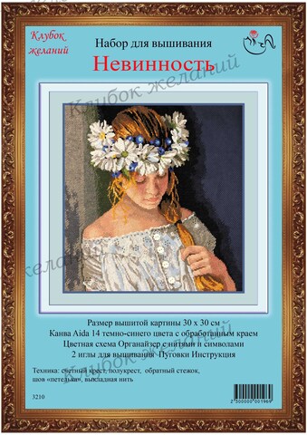 Вышитая картина: Юная девушка в венке из ромашек и васильков, стоит, прислонившись к стене. Наверное, она гадает, отрывая лепестки: любит – не любит. Опущенный взгляд, русая коса, выбившиеся на висках прядки волос. Легкое летнее платьице расшито швом «петелька», словно кружевное. Крест, полукрест. Для смешанных тонов прилагается специальный диспенсер. Дополнительные стежки, делающие картину такой прорисованной, выполнены обратным стежком. В оформлении используются пуговки, делающие наряд девушки таким живым и естественным. В работе использовано 30 цветов мулине.