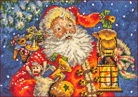 Вышитая картина: Дед Мороз ночью раздает подарки. Освещая свой путь фонарем, он приходит к нам. Все мы - и взрослые и дети, ждем этого чуда. В ярко-красном полушубке, рукавицах, с белой пышной бородой. Игрушки, те, о которых мечтали дети, и наши желания, старается выполнить он в это волшебное время. Время сказок. Используется 20 цветов мулине. Для смешанных цветов прилагается специальный диспенсер. Ручная вышивка.