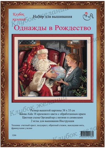 Вышитая картина: Какие только чудеса не свершаются под Новый год. К маленькой девочке пришел Дед Мороз. Присев в старинное кресло, он дарит ей необычный подарок – глобус. На глобусе этикетка – От Деда Мороза. Чтобы было понятно, что не мама с папой сделали этот подарок. Это не просто красивый шар – всю нашу планету вверяют новому молодому поколению, они будут беречь нашу планету и заботится о ней. Волшебная добрая картина. Крест, полукрест. Для смешанных тонов прилагается специальный диспенсер. Дополнительные стежки, делающие картину такой прорисованной, выполнены обратным стежком. В работе использовано 43 цвета мулине.