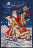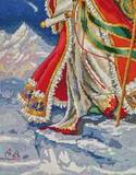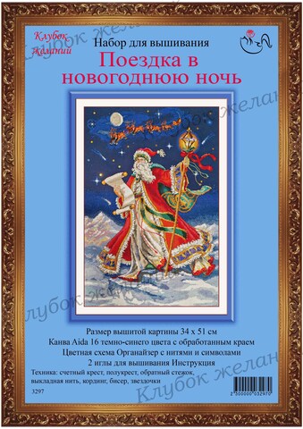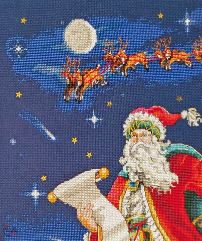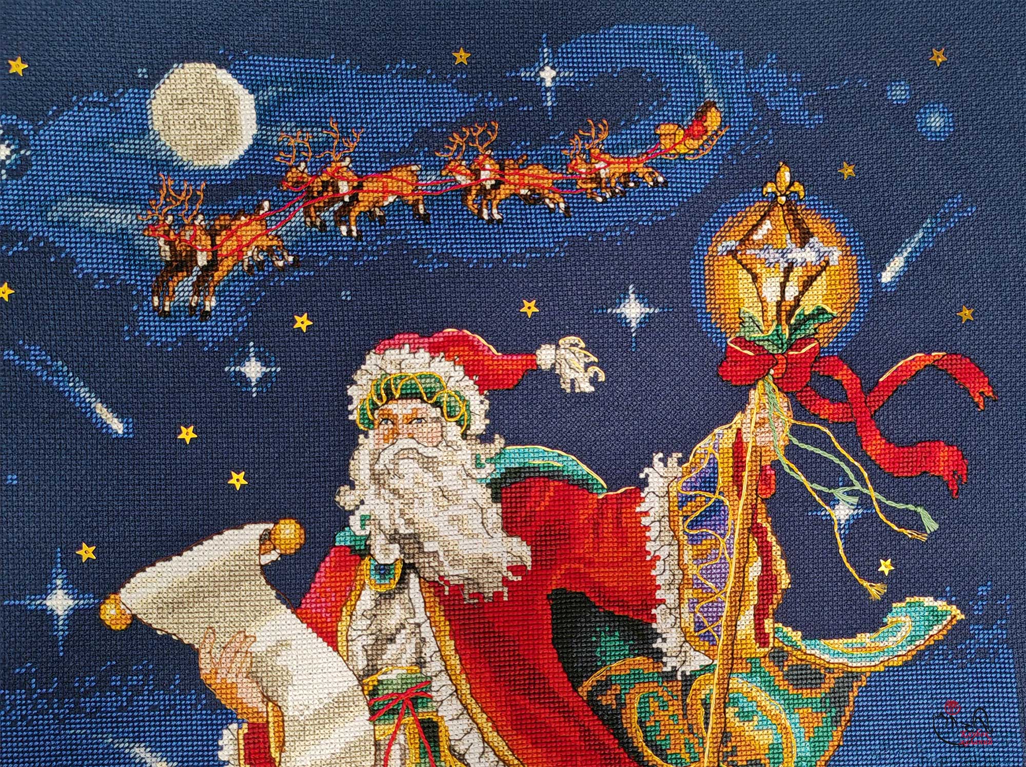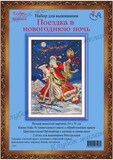 Вышитая картина: Яркая эффектная новогодняя картина. Дед Мороз – здесь он представлен во всей красе, словно волшебник из сказки. Ярко-красная длинная шуба расшита узорами, золотыми нитями и бисером. Широкий зеленый пояс развевается на ветру. В одной руке он держит свиток – список с подарками для детей. В другой – волшебный посох с ярким оранжевым фонарем, чтобы среди ночи найти к нам верный путь. Вдали скачет во весь опор упряжка оленей. Это они помогают вовремя доставить все подарки. Высокое и чистое небо в новогоднюю ночь, по которому рассыпаны золотые звёздочки. Используется 40 цветов мулине. Для смешанных цветов прилагается специальный диспенсер. Ручная вышивка.