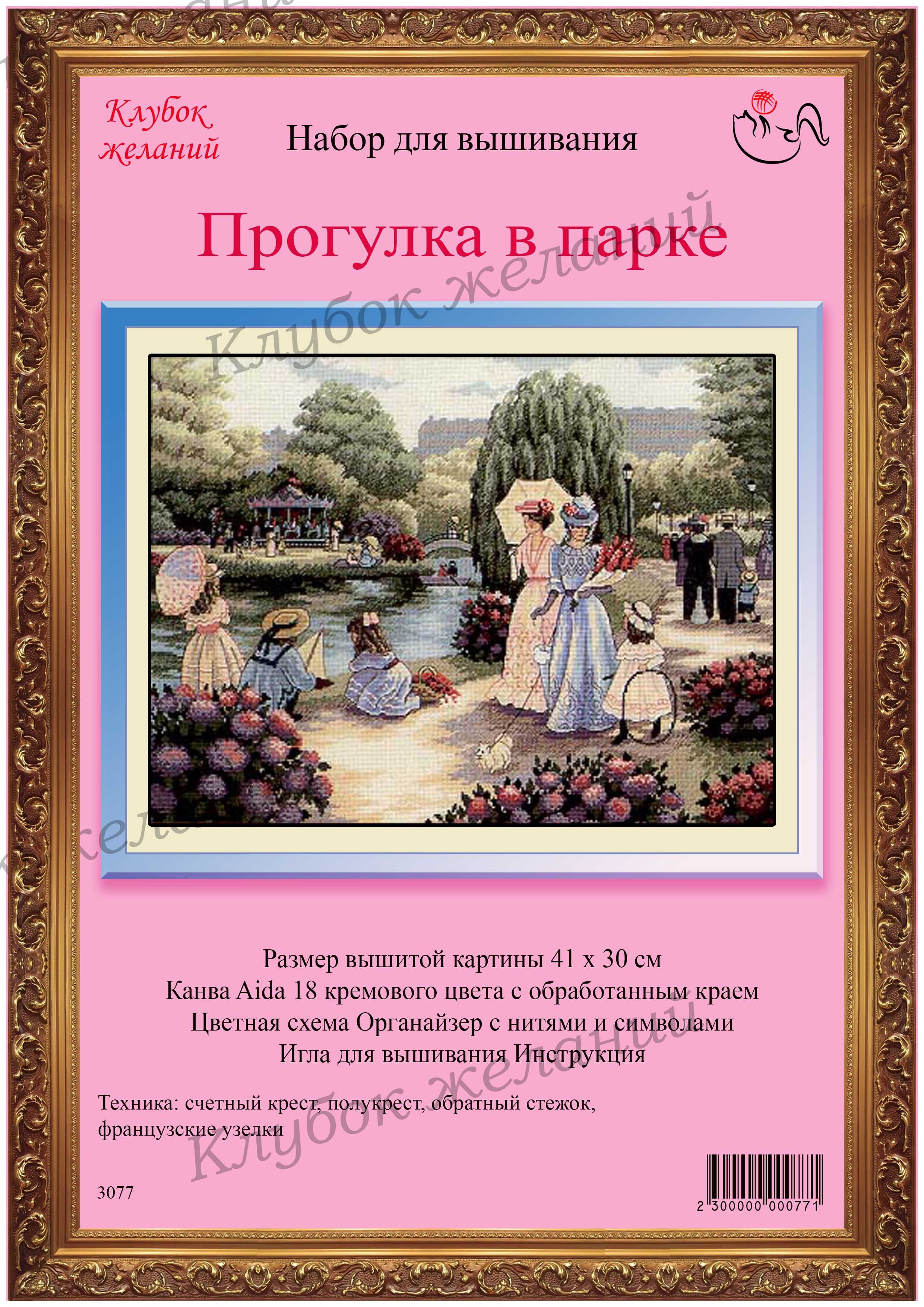 Вышитая картина: Солнечный летний день. Чудесный парк. Взрослые и дети пришли сюда, чтобы провести выходной день. Дорожка вдоль пруда, дети запускают кораблик. На переднем плане две дамы с девочкой и собачкой. Пожалуй, трудно найти другую столь проработанную в деталях, картину. На самой мелкой канве становится возможным вышить-прорисовать прекрасные платья дам, с тонкими узорами, карусель на заднем фоне, детские костюмчики, ажурные зонтики. Работа не простая, но доставляет настоящее удовольствие при вышивании. Шьется легко – в 2-3 нити. Обшивка кропотливая, но понятная и сразу дает ощущение четкости и прорисованности образов. Для смешанных тонов прилагается специальный диспенсер. Используется 40 цвета мулине. Ручная вышивка.