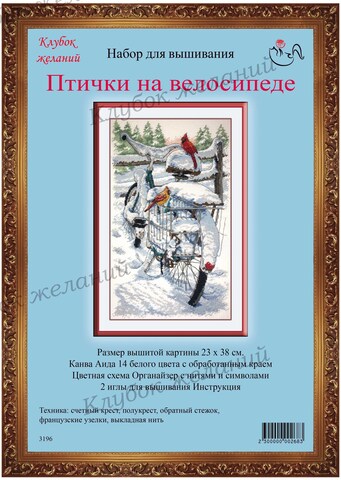 Вышитая картина: Неожиданно пришла зима. За ночь выпал снег и укрыл толстым пушистым ковром весь двор. Под белым «одеялом» оказался и велосипед. Шапки снега на сиденье, корзинке, раме велосипеда. Только виден красный краешек катафота на заднем крыле. И тут же слетелись птички поискать зернышек в велосипедной корзинке. Крест и полукрест. Для смешанных тонов прилагается специальный диспенсер. Дополнительные стежки, делающие картину такой прорисованной, выполнены обратным стежком. В работе использовано 28 цветов мулине.