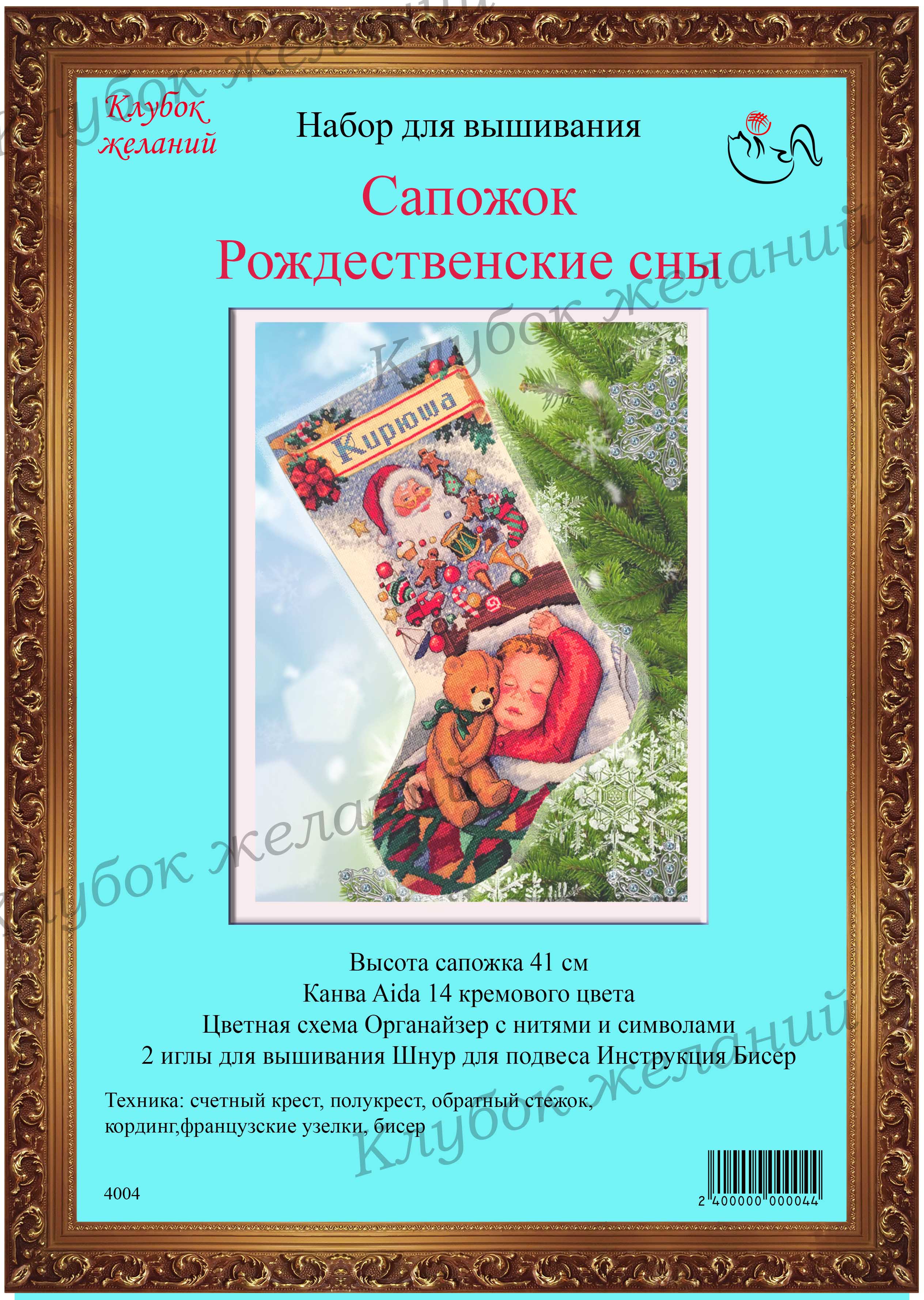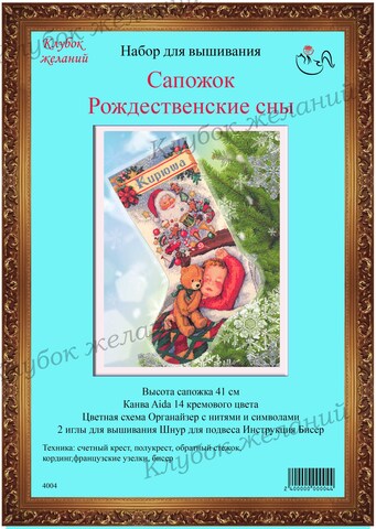 Рождественский новогодний сапожок для подарков. Каждый мечтал о таком в детстве, и до сих пор такое поздравление будет необыкновенным и запоминающимся на всю жизнь – ведь он именной. Вышивается имя по вашему выбору. Прилагается русский и латинский алфавит. Для смешанных цветов – специальный диспенсер. Украшения – золотая нить, бисер серебристого и золотого цвета. Используется 40 цветов мулине. Ручная вышивка.