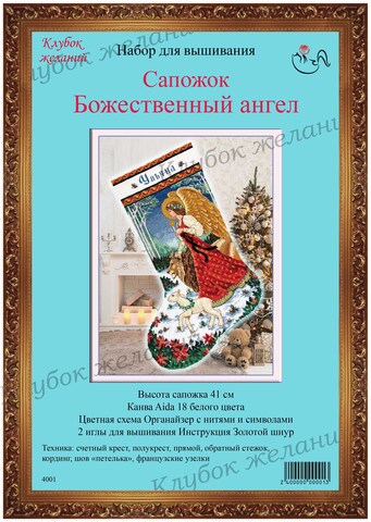 Рождественский новогодний сапожок для подарков. Такое поздравление будет необыкновенным и запоминающимся на всю жизнь – ведь он именной. Вышивается имя по вашему выбору. Прилагается русский и латинский алфавит. Прекрасный ангел с сияющими крыльями за спиной и свечой в руке идет к нам в рождественскую ночь. Рядом защитник – лев, царь зверей. И милый маленький козленочек. Он не боится грозного льва, вдвоем они олицетворяют мир и дружбу. Вышивается в 2-3 нити. Особое украшение – швы, выполненные золотой нитью. Это главное украшение сапожка. И золотой шнур для подвеса, который входит в набор. Для смешанных тонов специальный диспенсер. Используется 32 цвета мулине. Ручная вышивка.