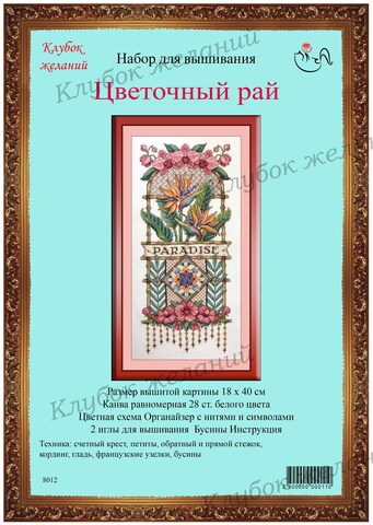 Вышитая картина: Много различных техник вышивания собрано в данном сэмплере. Кроме счетного креста, в центре картины ромб, он вышивается мелкими крестиками, по размеру в 1/4 обычного. Это удивительно кропотливая и тонкая техника вышивания. Он расположен на фоне вышивки гладью – горизонтальной и вертикальной. Цветы орхидей, магнолий, стрелиции (райская птица) дополняют сэмплер. Оригинальная бамбуковая арка и завершение – низ полотна, вышитый родосским стежком с золотыми бусинами. Для смешанных тонов прилагается специальный диспенсер. Для всех видов стежков дополнительные крупные цветные схемы и инструкция. Используется 35 цветов мулине. Ручная вышивка.