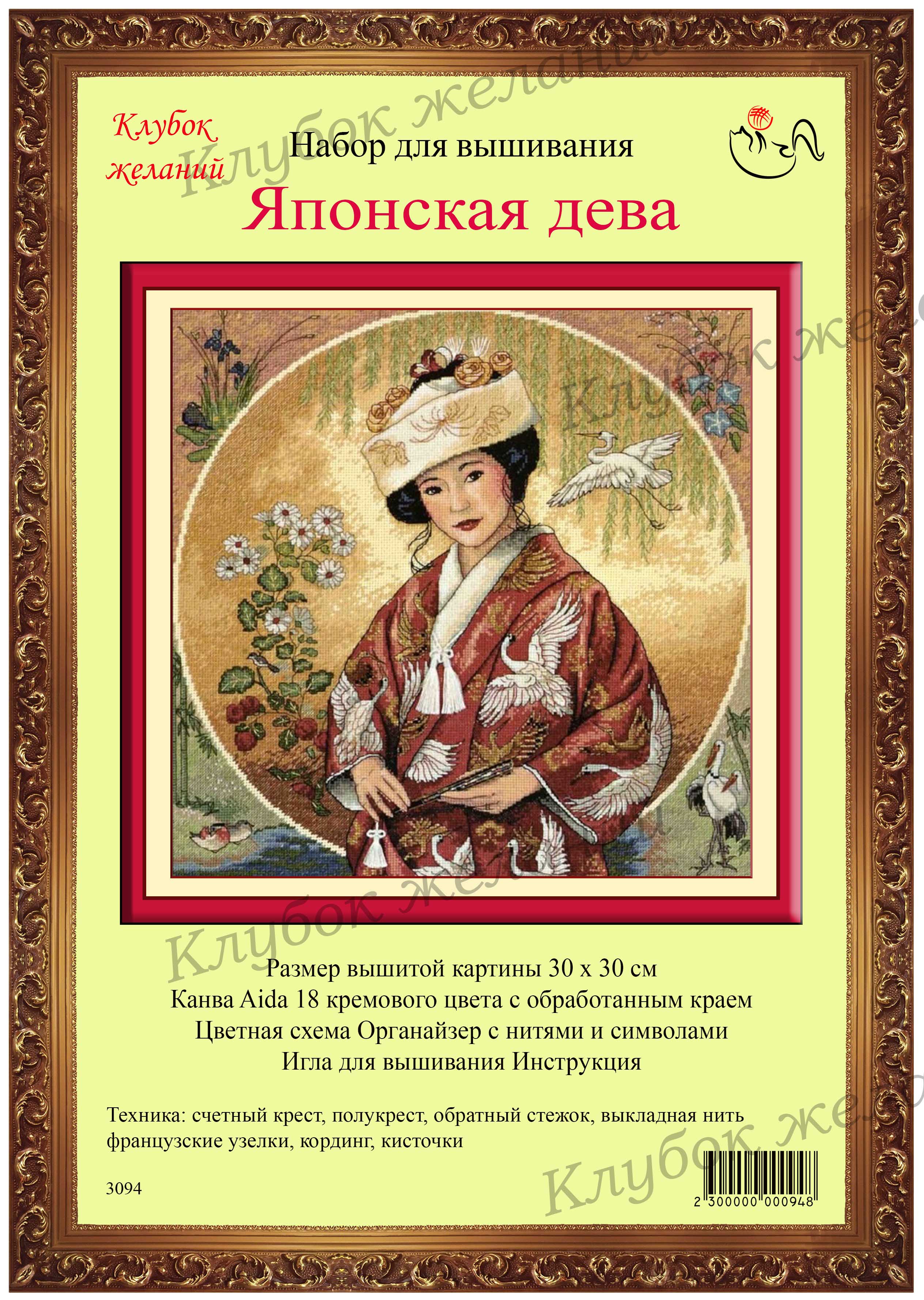 Вышитая картина: Прелестная японская девушка на портрете. В этой картине проявились все японские мотивы – великолепно расшитое кимоно, белые японские цапли. Декор из бамбука, хризантем и даже уточки-мандаринки в углу картины. Золотом расшиты отдельные элементы. И особый акцент – три кисточки, украшающие картину. Много смешанных тонов, для них прилагается специальный диспенсер. Крест и полукрест в 2-4 нити. Множество мелких деталей, делающих картину живой, выполнены обратным стежком. Используется 38 цветов мулине. Ручная вышивка.