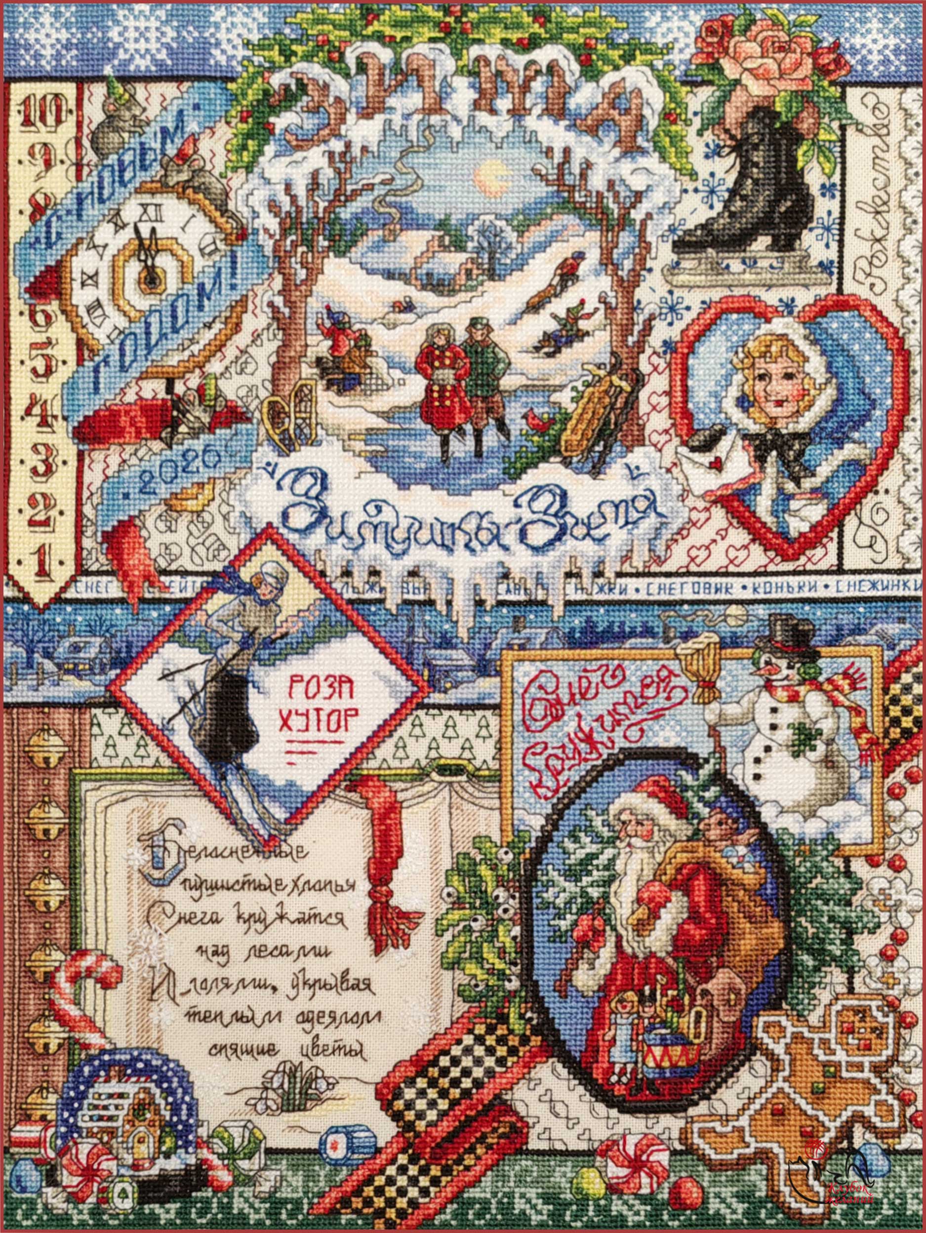 Вышитая картина: Зима! Волшебная, снежная, пушистая, искрящаяся. Прекрасное время года с нашими любимыми праздниками, веселье, коньки, лыжи, время приключений. На этом полотне мы видим все милые зимние образы. Это часы со стрелками около 12 часов. Катание на коньках и лыжах, снеговик и Дед Мороз с подарками. Можно вышить год, который вам памятен. Мы вышили 2026 год. Для этого прилагается схема с цифрами. И конечно после снежной зимы мы будем ждать весну, о чем можно также прочитать на нашем семплере. Используется 40 цветов мулине. Ручная вышивка.