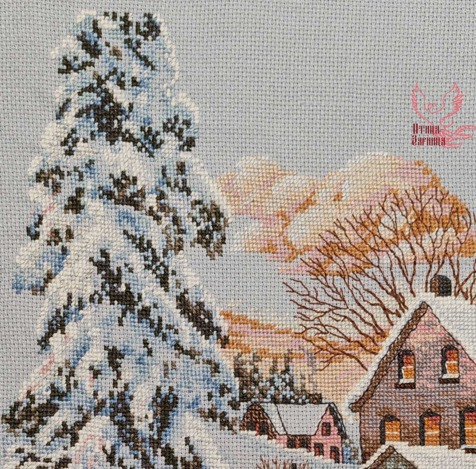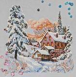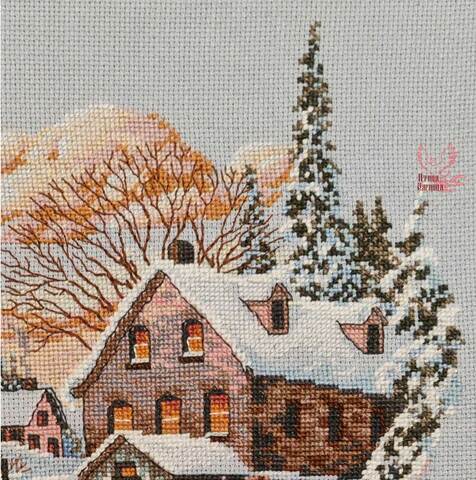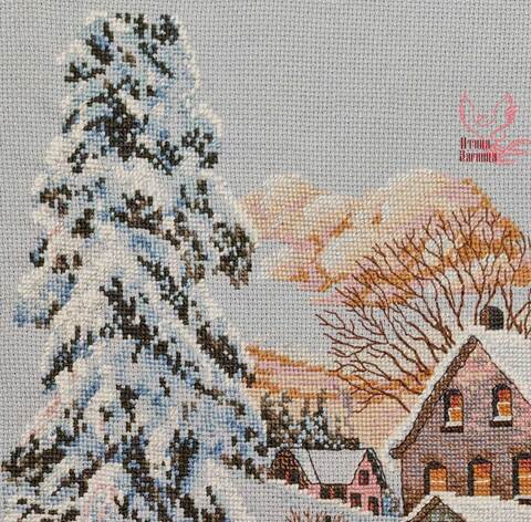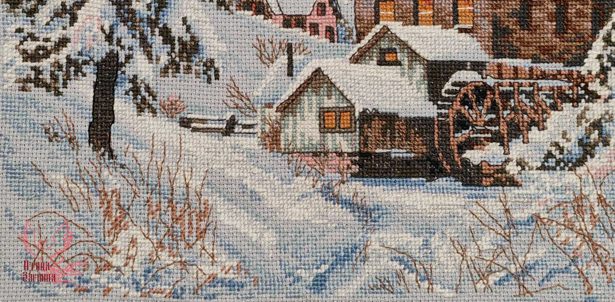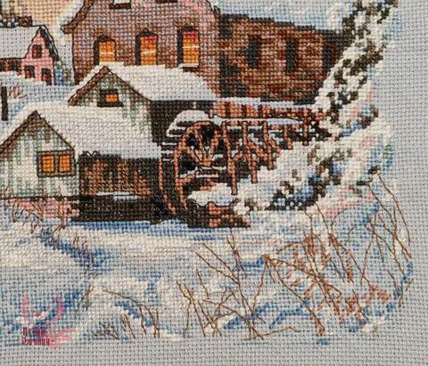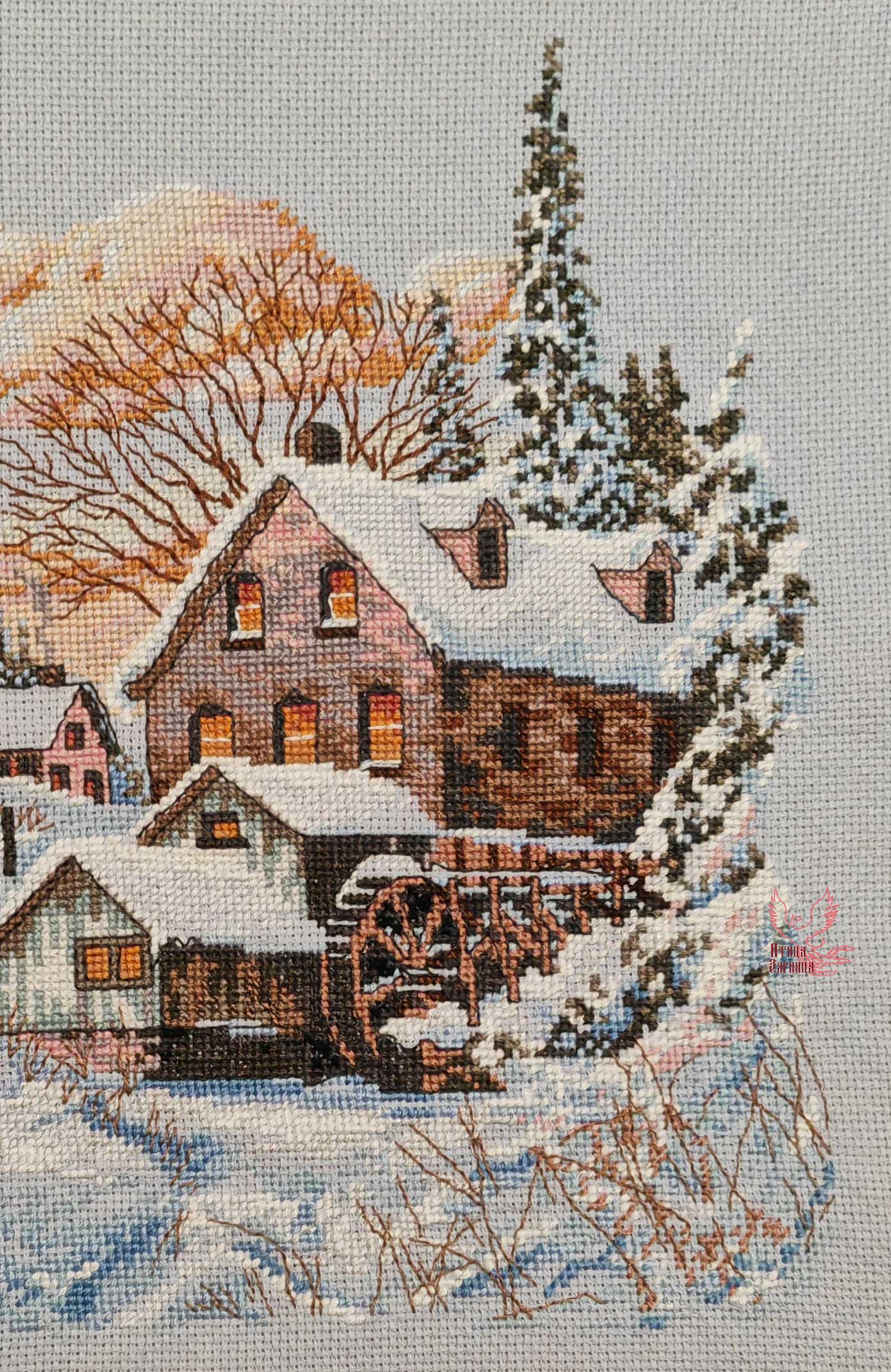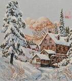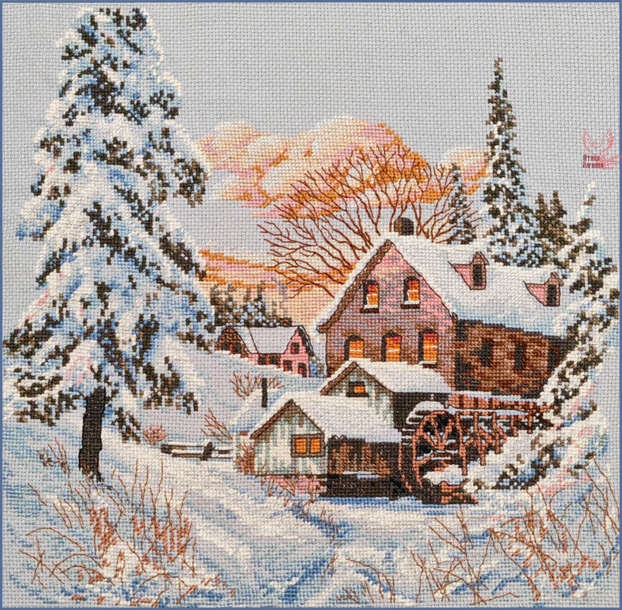 Вышитая картина: Зима. Укрытая толстым слоем снега, спит мельница. Это время отдохнуть от летней работы. Вокруг ели, серебрится на их ветвях иней. Замерзла и речка, и небольшой пруд возле мельницы. Только торчат кое-где стебли прошлогодней травы. В зимнем небе розовые облака. Наверное, к морозу. Но в окнах домов вилен свет, там тепло и уютно. Картина вышивается крестом и полукрестом. Для смешанных тонов прилагается специальный диспенсер. Дополнительные стежки, делающие картину такой прорисованной, выполнены обратным стежком. В работе использовано 24 цвета мулине, серебристый металлик.