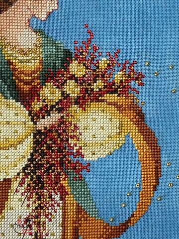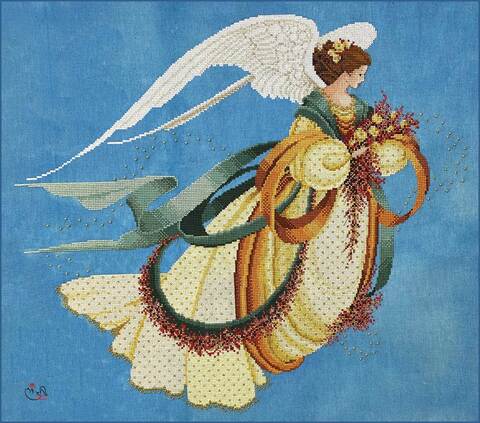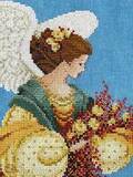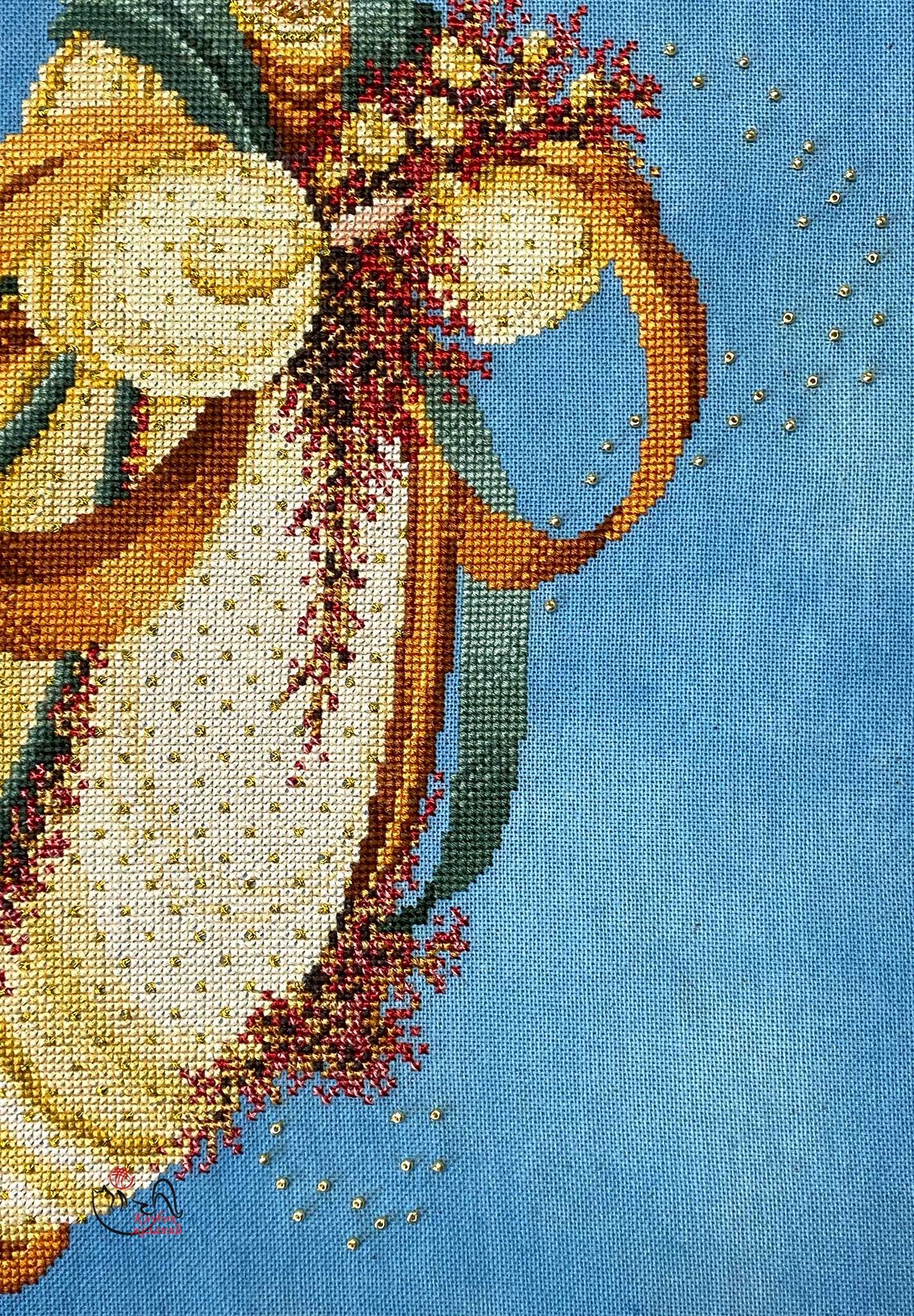 Вышитая картина: Это прекрасный осенний ангел. Раскинув белые крылья, в образе милой девушки, летит в небе, сообщая нам, что лето закончилось. Природа окрашивается в золотые и багряные тона, готовится к отдыху и зимнему сну. Великолепное платье ангела расшито золотыми нитями. Края юбки украшены по низу светло-золотым бисером. Сама юбка – золотым металликом. В руках ангела осенний букет, такими же цветами окружен бант-шлейф. Особенный штрих данной картины – применение нитей с особым ярким блеском, а также меланжевых мулине. Золотым бисером по фону вышито сияние ангела. Прекрасно смотрится с другими ангелами этой серии – Ангел зимы – 8078, Ангел лета – 8076, Утренний ангел арт. 8011, Ангел любви – арт. 8024, Ангел моря- арт. 8025, Ангел надежды – 8072, и другие. Используются 30 цветов мулине. Ручная вышивка.