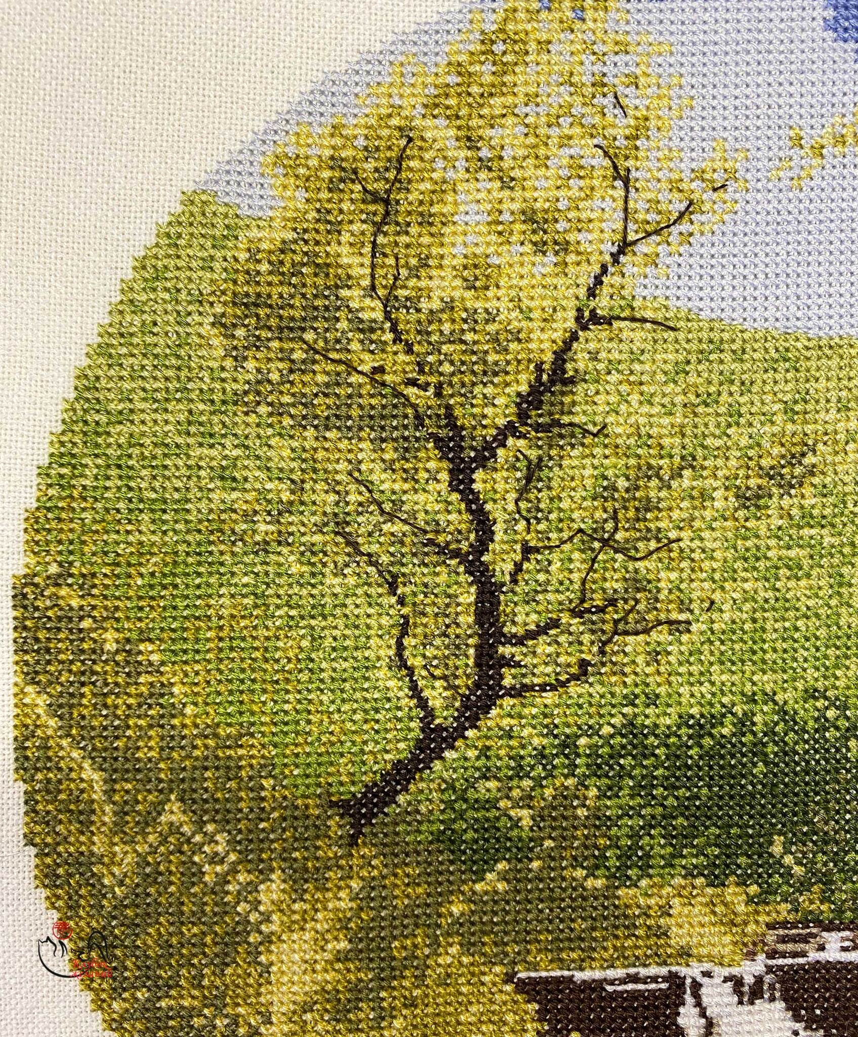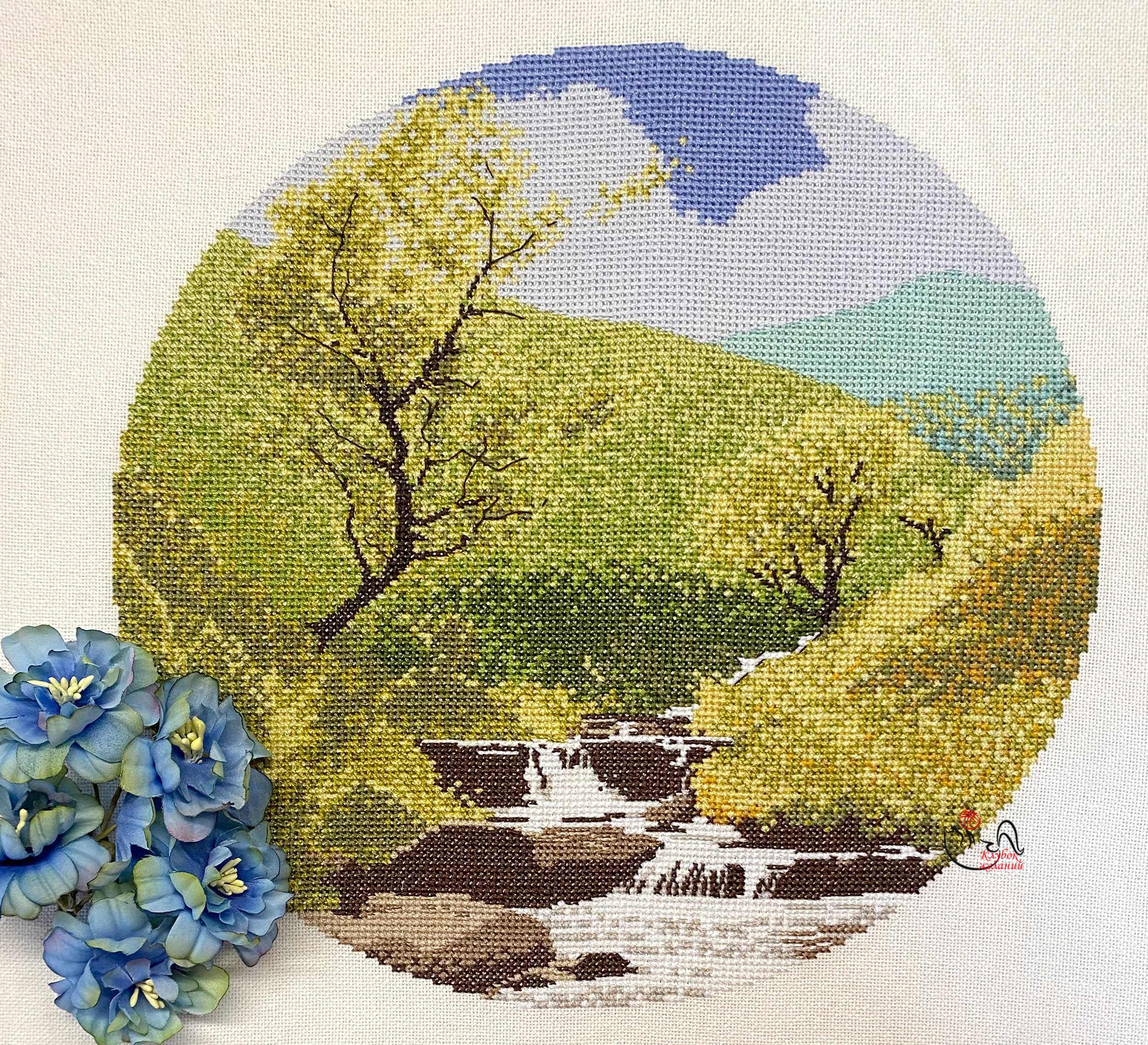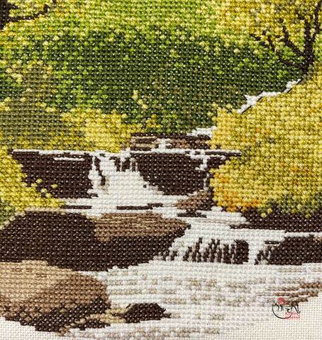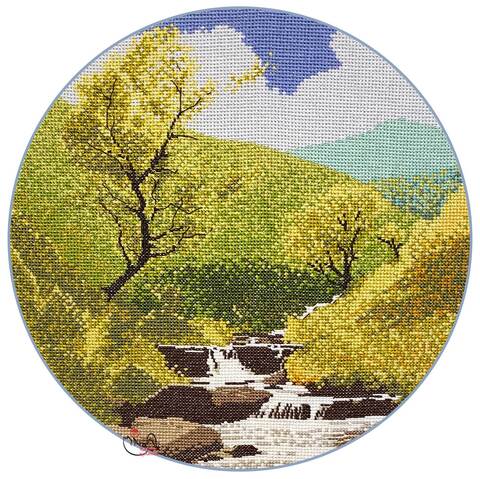 Вышитая картина: Горы, поросшие зарослями кустарников и деревьев. С небольшого склона бежит в долину чистый холодный ручей. Бежит и прыгает по камням, принося нам свежесть и радость чистой прозрачной воды. Перекатываются струи, блестя на солнце. Вдали видны высокие горы. Высокое и ясное небо над головой. Никаких признаков цивилизации. Тишина и покой вокруг, только шум горного ручья. Словно кадр, сделанный фотоаппаратом, окно в старые добрые времена. Особенностью дизайна являются узкие кресты, которыми дополнена картина. . Используется 20 цветов мулине.