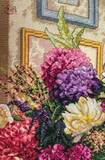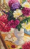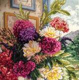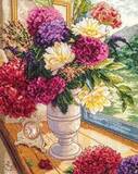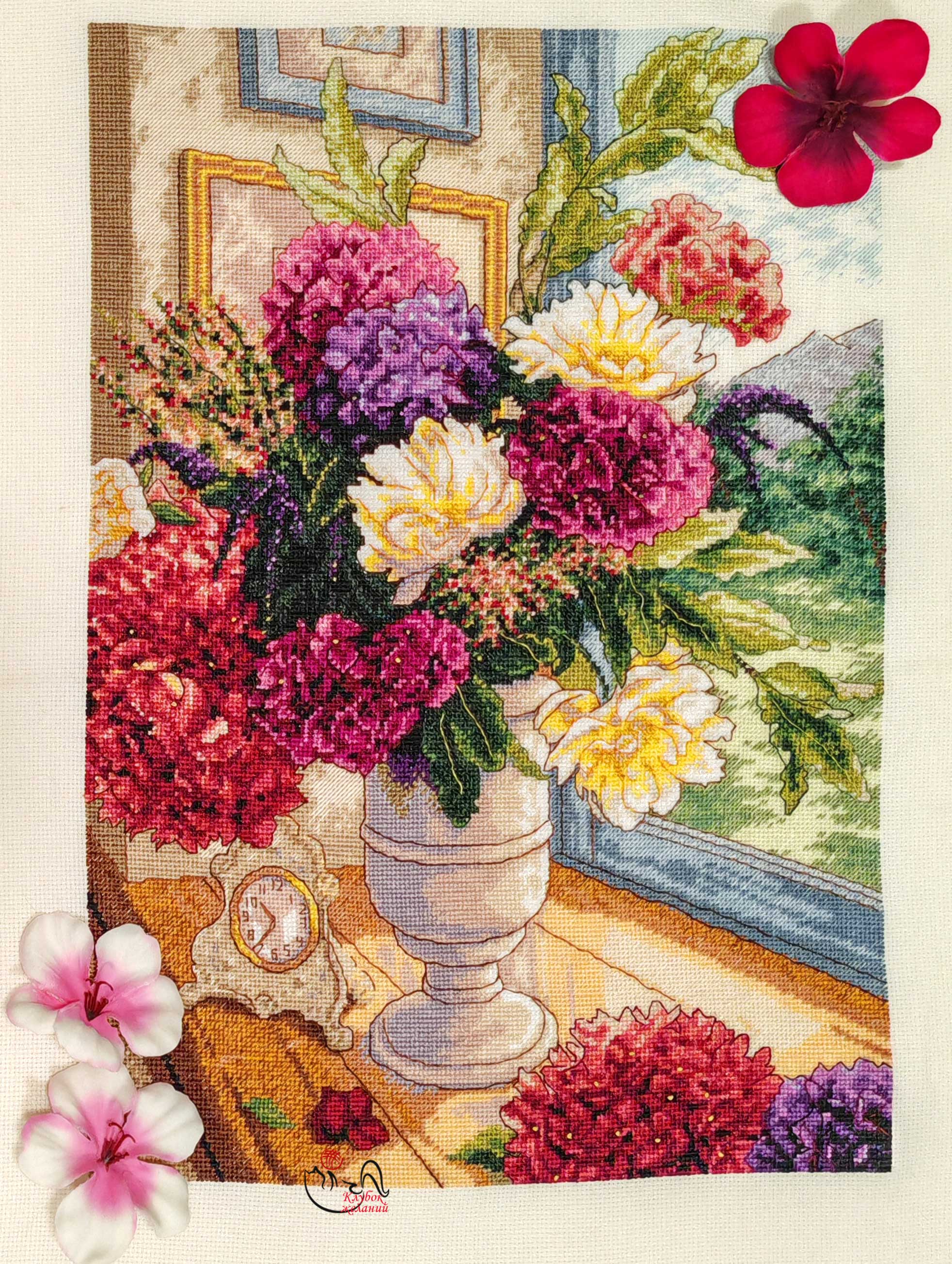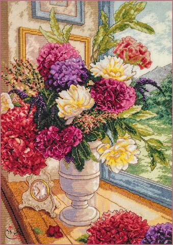 Вышитая картина: Яркая и по-настоящему летняя картина. На подоконнике, ярко освещенном солнечными лучами, стоит букет летних цветов. Ярко и пышно раскрылись соцветия пионов, хризантем, в обрамлении пышной зелени. За окном- зеленая долина, холмы и высокое голубое небо. Белая элегантная ваза и старинные чудесные часики. Посмотрите, они показывают утро – половина одиннадцатого. Возможно, в этой комнате залучала музыка, играли на рояле. Все напоминает о добрых старых временах. Используется 41 цвет мулине. Ручная вышивка.
