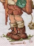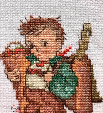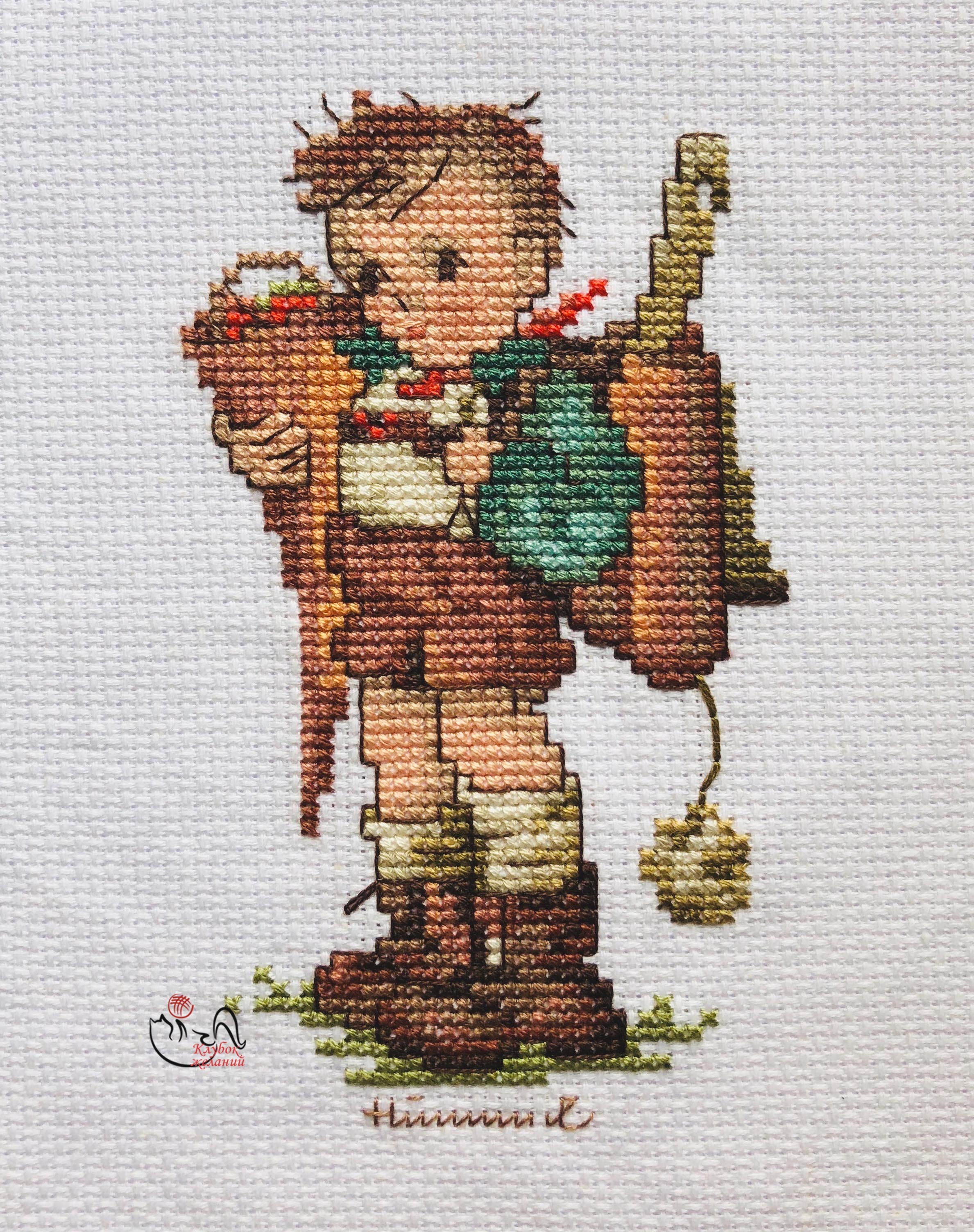 Вышитая картинка. Мальчик с рюкзачком за спиной. Он собирается в школу. Шортики и белая рубашка, зеленая курточка. В пакете- все, что не уместилось в рюкзак. В рюкзаке – линейка и много учебников и тетрадок. Коричневые башмаки и белые гольфы. В работе использован 18 цветов мулине.