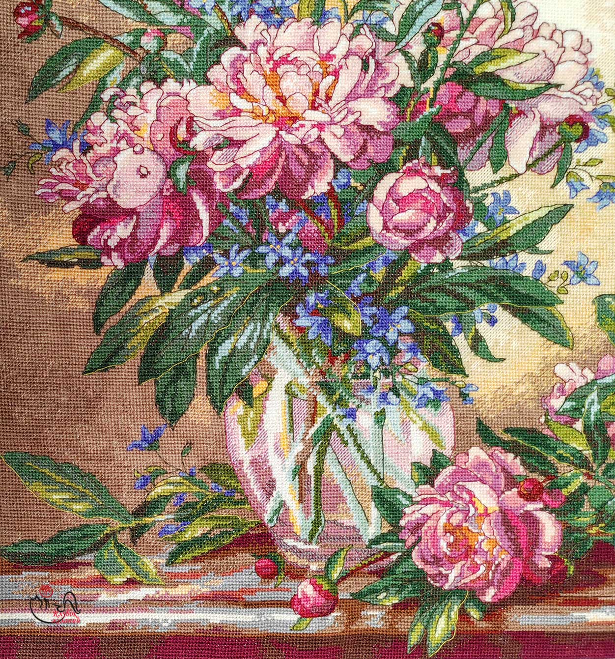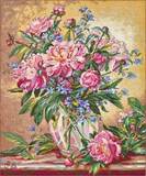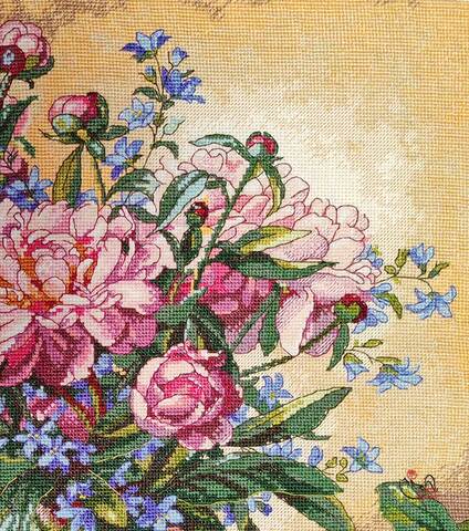 Вышитая картина: Роскошный букет летних цветов во всей своей красе стоит на столе в прозрачной вазе. Необычное сочетание: пионы и колокольчики. Пышные розовые шапки пионов занимают основное пространство. Их удлинённые листья и тугие круглые бутоны прорисованы очень натурально и выглядят совершенное живыми. Мы словно чувствуем их тонкий аромат. И к пышным соцветиям пионов в букете добавлены нежно-синие колокольчики. Их тонкие стебельки смотрятся нежными и хрупкими. В этом и красота составляемого букета – яркость, пышность и нежность. Используется 41 цвет мулине. Ручная вышивка.