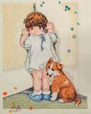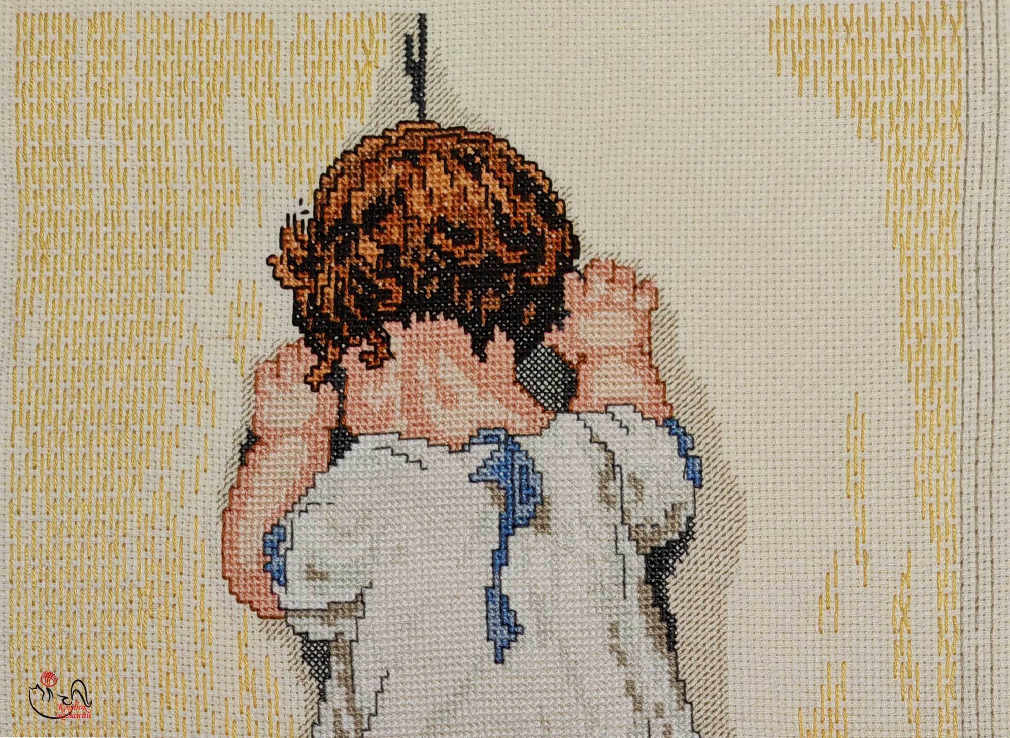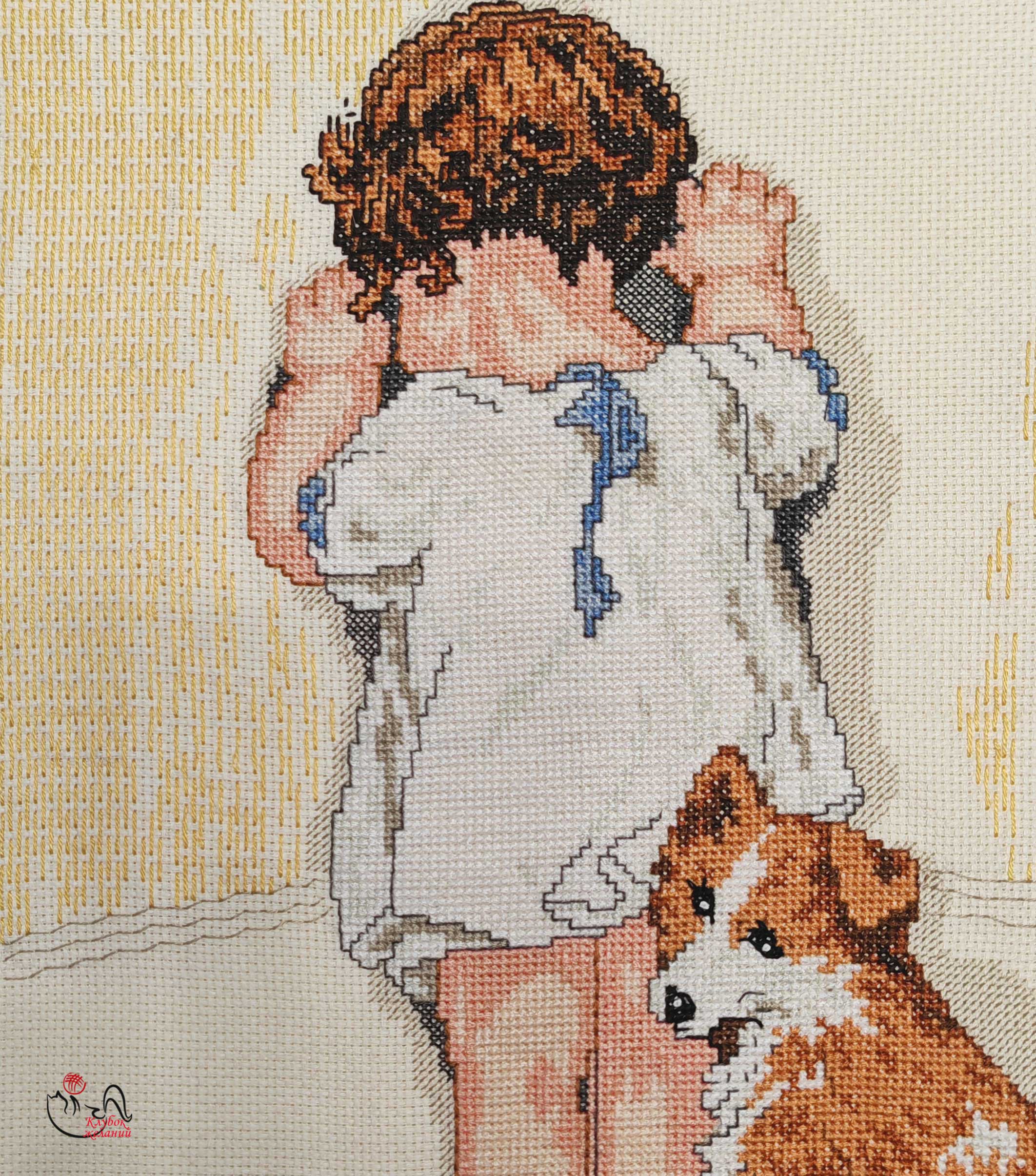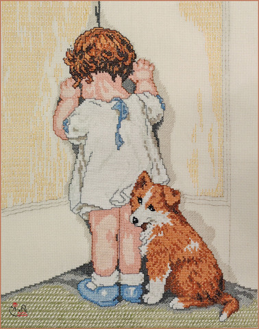 Вышитая картина: Эта картина никого не оставит равнодушным. Малышку наказали. Но рядом ее верный друг- рыжий песик. Его взгляд - прямой укор всем вокруг. С какой нежностью предаёт все это вышитая картина. Особенность дизайна – длинные прямые стежки, которыми выполняется фон. Приятная цветовая гамма пастельных тонов делает процесс вышивания легким и приятным. Используются 17 цветов мулине в 28 комбинациях. Ручная вышивка.