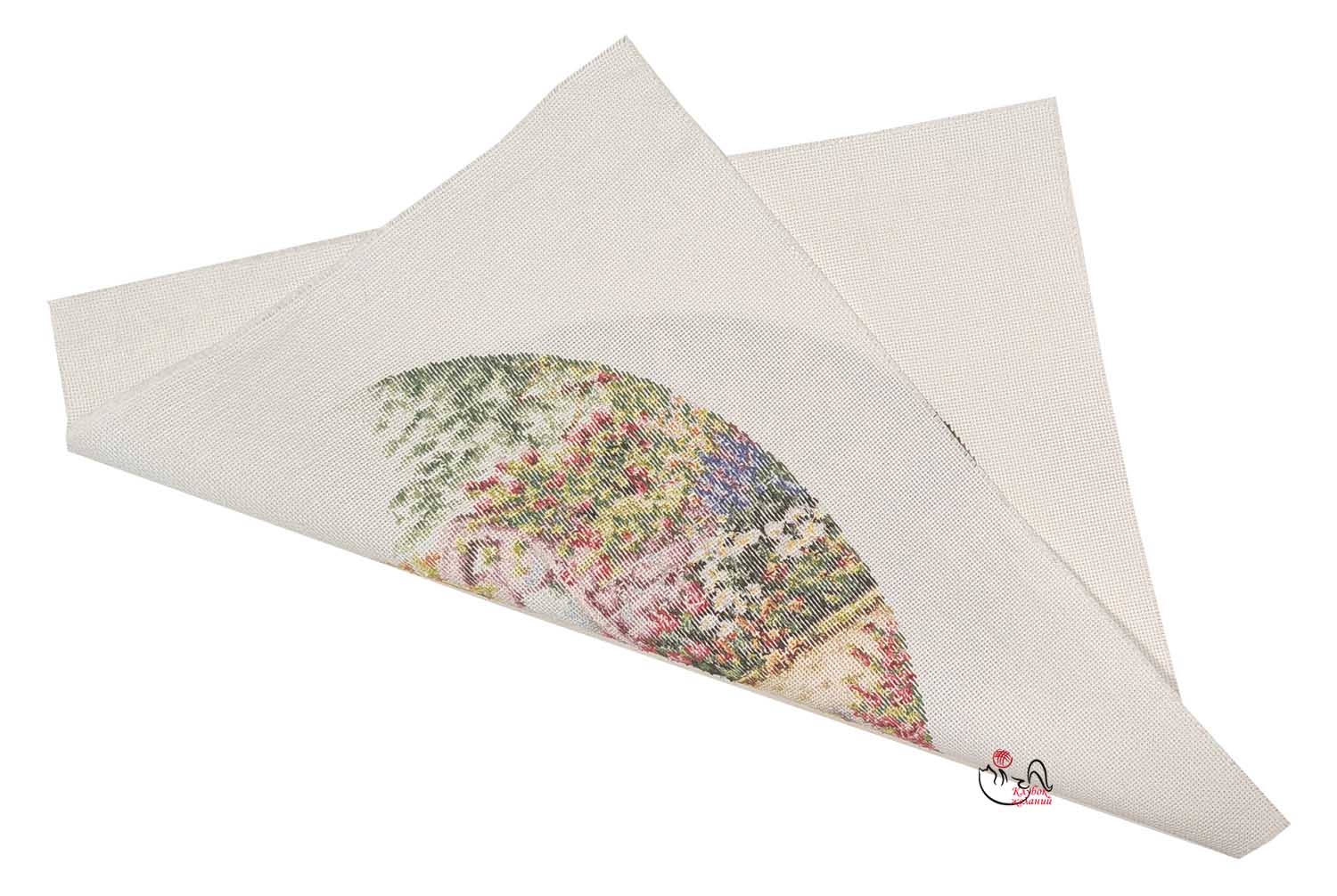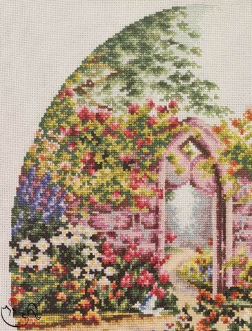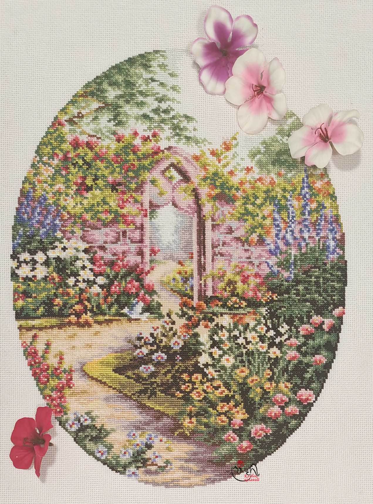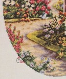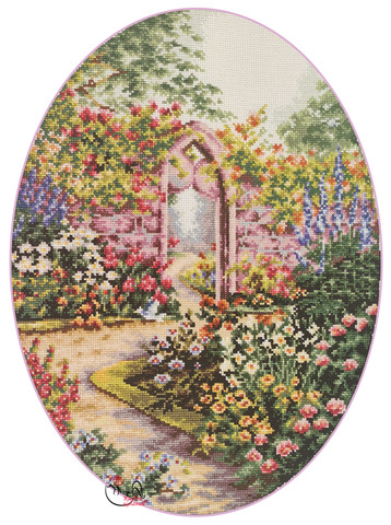 Вышитая картина: Яркая, наполненная ароматами цветущего сада, картина. Мы видим песчаную дорожку, она ведет вокруг клумбы. Ведет она через красивые арочные ворота. Стена увита цветущими растениями, вокруг цветочное великолепие, куда не брось взгляд. Интересен формат картины, расположенной в овале. Это серия полотен, созданных в таком стиле, по временам года. Используется 37 цветов мулине. Ручная вышивка.