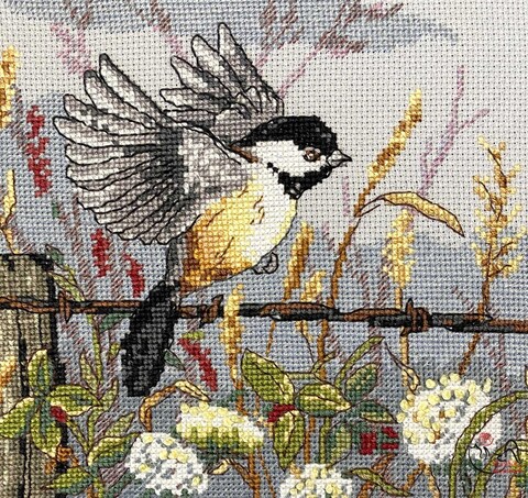 Вышитая картина: семейство синичек устроились на заборе. Пи-пи, пи-пи,- общаются они. Яркие животики, темные хвостики, глазки-бусинки. Пышные заросли трав вокруг них. Особенный акцент картины – объемные в 3 нити французские узелки, вышитые на соцветиях цветов. Они придают натуральность и объемность изображению. Мягкие пушистые цветущие шары доносят до нас запах лета и воспоминания о теплых днях. Обшивки не много, но она очень важна. Подчёркнуты перышки птиц, клювы и лапки. Используется 26 цветов мулине. Ручная вышивка.