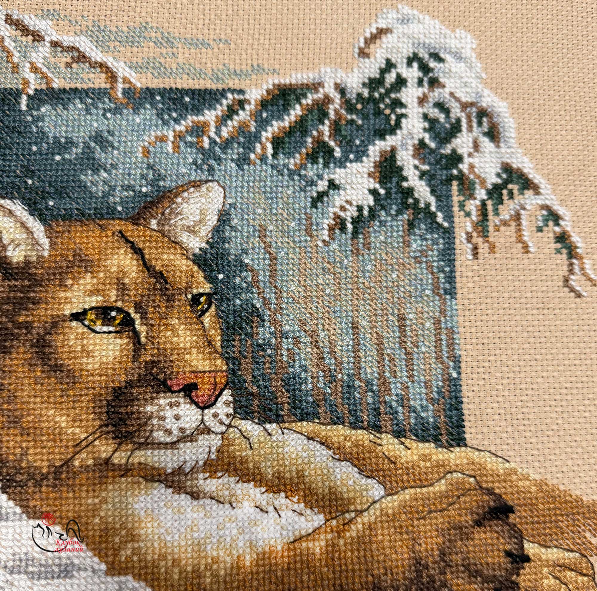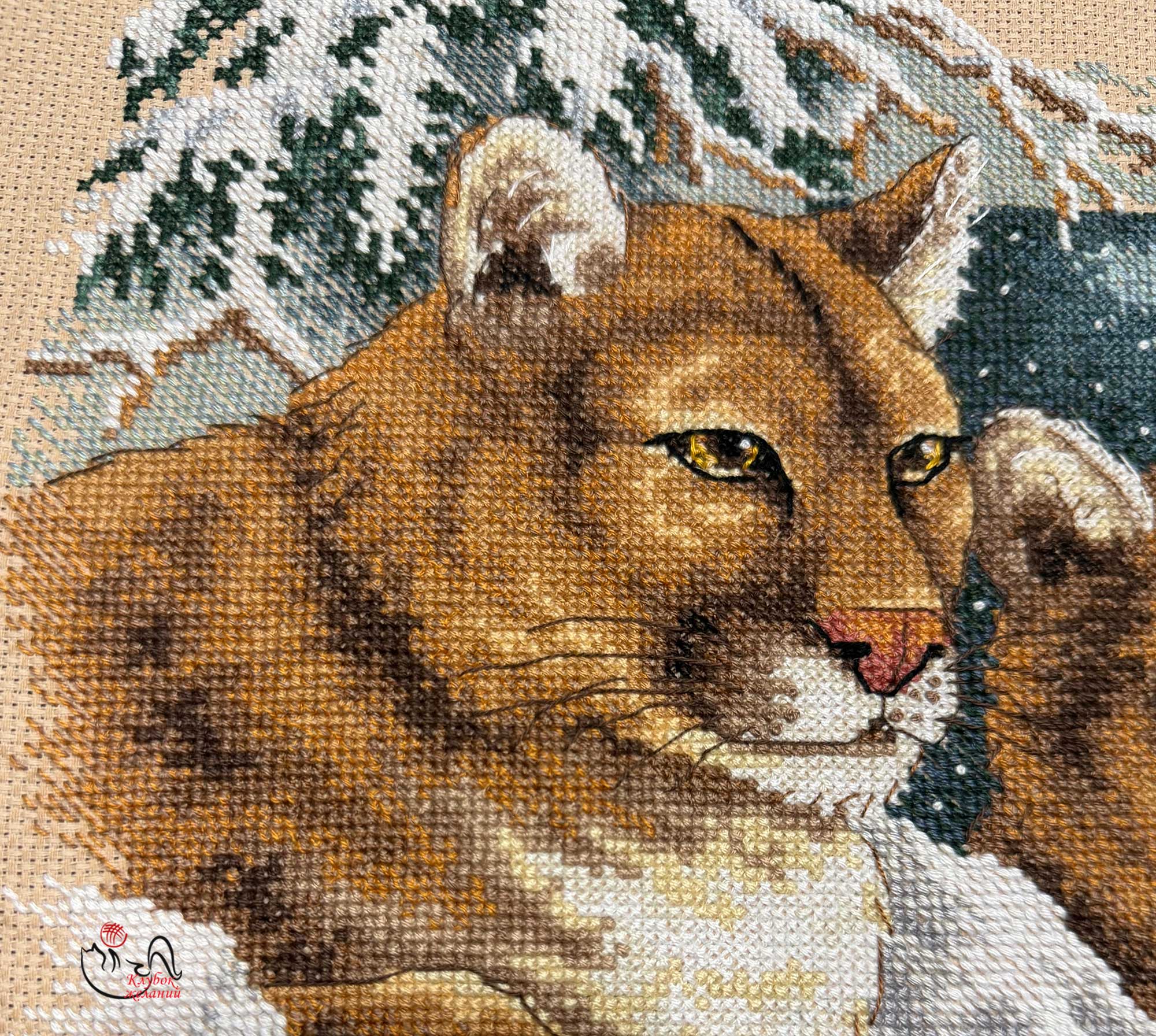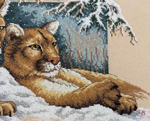 Вышитая картина: Два прекрасных зверя расположились на отдых под раскидистыми лапами елей. Вокруг снег, на ветвях деревьев лес укрыт снежным покровом. Но пумам не холодно. Тёплый плотный мех защищает их от мороза. Чуткие уши прислушиваются, желтые глаза внимательно словно следят за нами. Они поигрывают мощными лапами, втягивая и выпуская когти. Сильные красивые звери. Настоящие хозяева высоких гор и лесов. Используется 26 цветов мулине. Ручная вышивка.