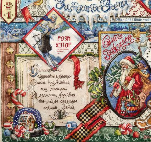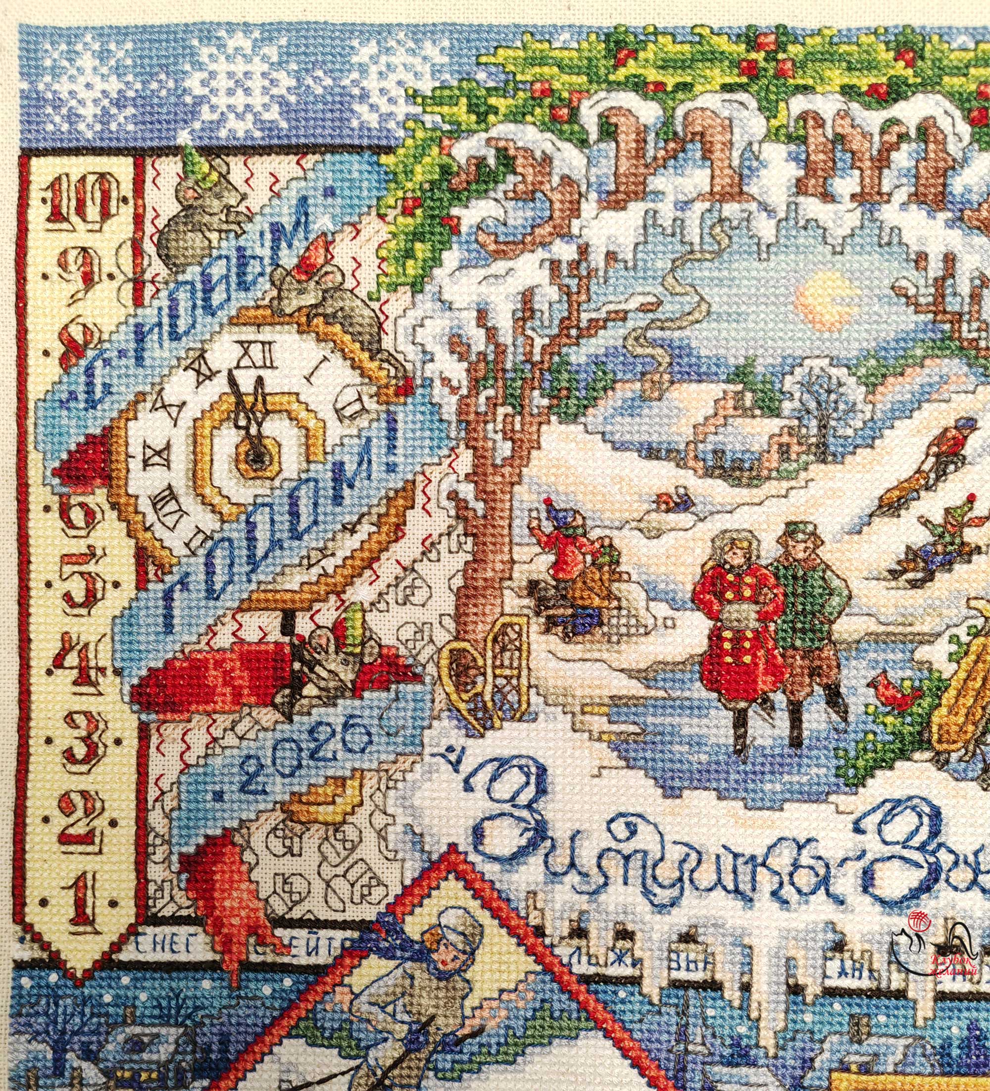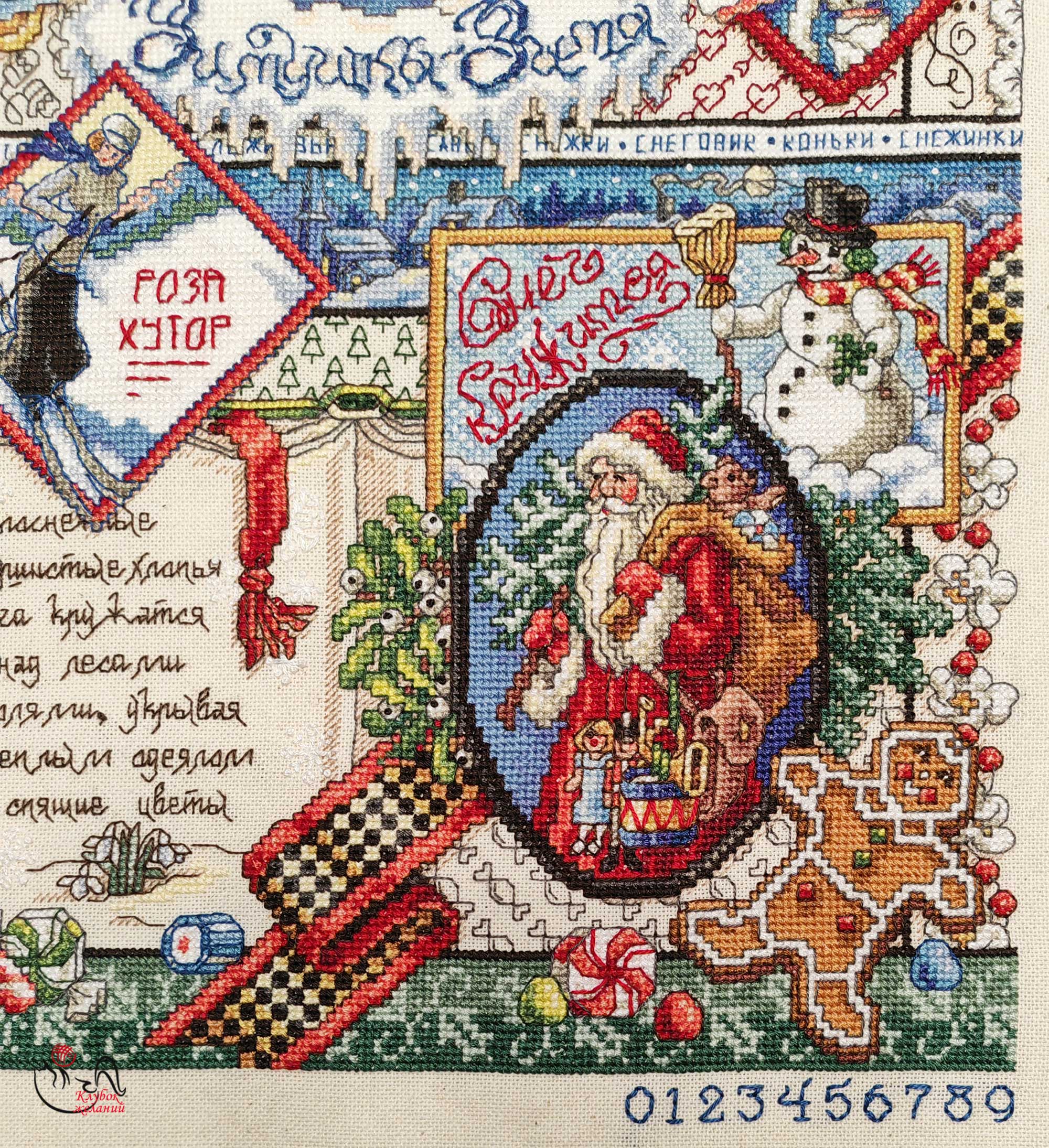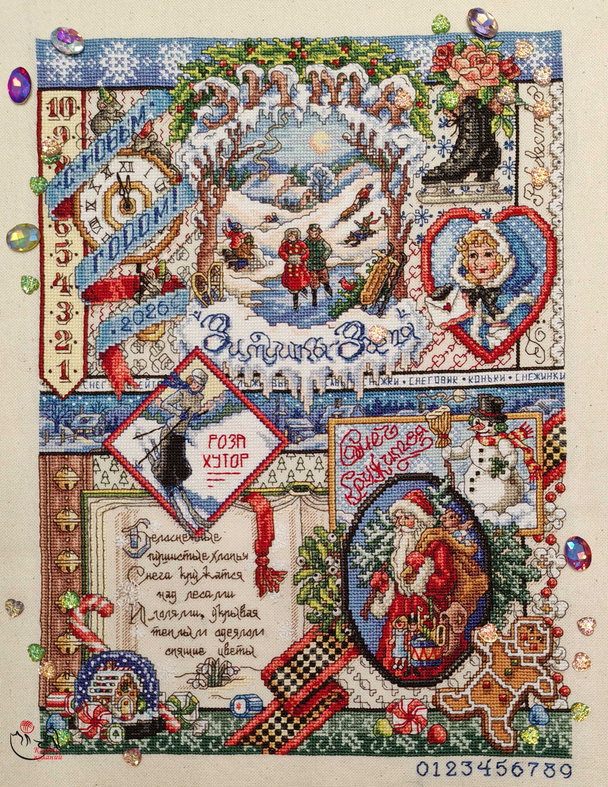 Вышитая картина: Зима! Волшебная, снежная, пушистая, искрящаяся. Прекрасное время года с нашими любимыми праздниками, веселье, коньки, лыжи, время приключений. На этом полотне мы видим все милые зимние образы. Это часы со стрелками около 12 часов. Катание на коньках и лыжах, снеговик и Дед Мороз с подарками. Можно вышить год, который вам памятен. Мы вышили 2026 год. Для этого прилагается схема с цифрами. И конечно после снежной зимы мы будем ждать весну, о чем можно также прочитать на нашем семплере. Используется 40 цветов мулине. Ручная вышивка.